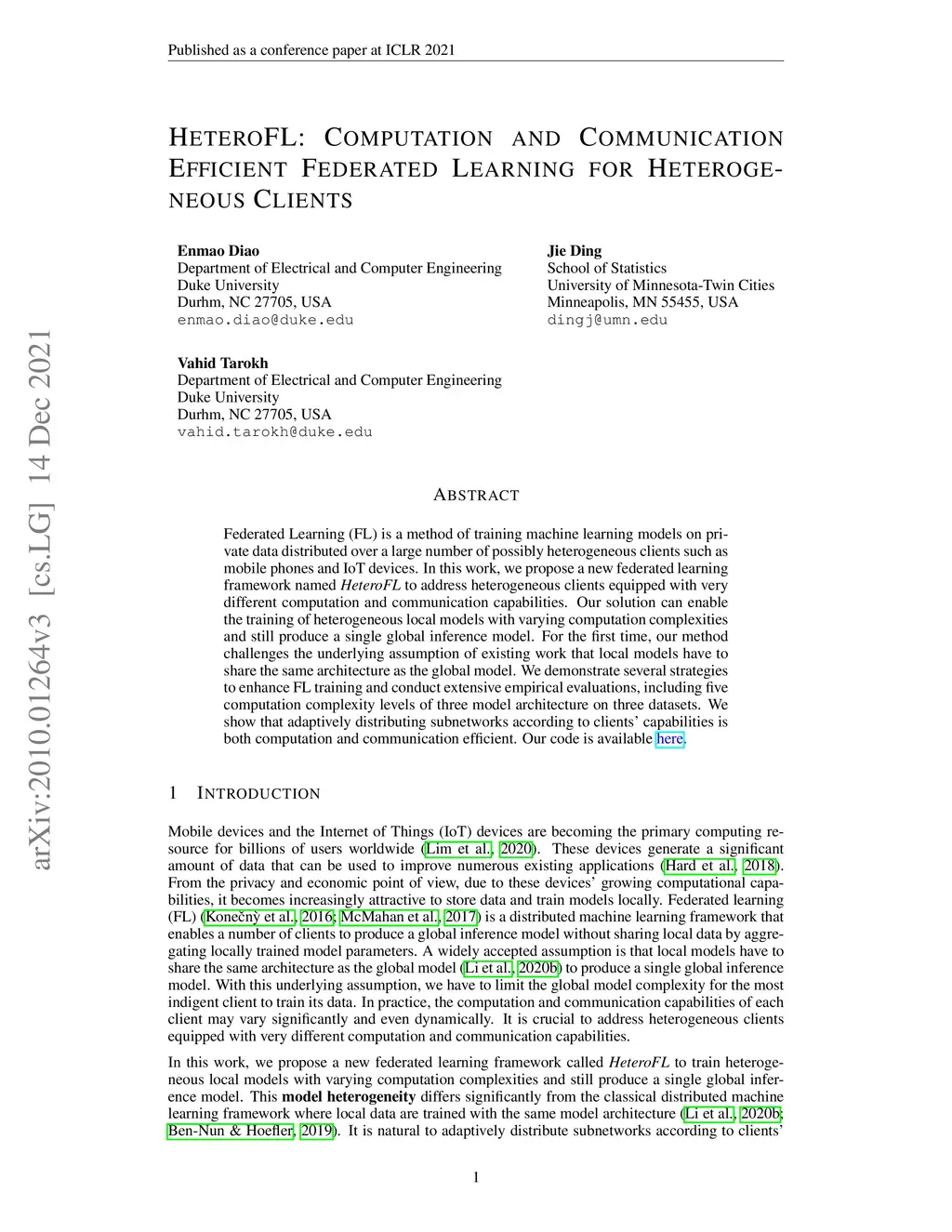HeteroFL: Computation and Communication Efficient Federated Learning for Heterogeneous Clients