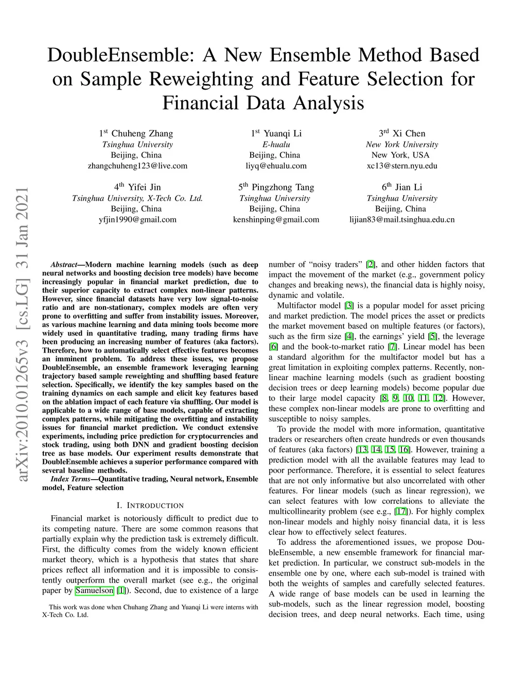 Modern machine learning models (such as deep neural networks and boosting decision tree models) have become increasingly popular in financial market prediction, due to their superior capacity to extract complex non-linear patterns. However, since financial datasets have very low signal-to-noise ratio and are non-stationary, complex models are often very prone to overfitting and suffer from instability issues. Moreover, as various machine learning and data mining tools become more widely used in quantitative trading, many trading firms have been producing an increasing number of features (aka factors). Therefore, how to automatically select effective features becomes an imminent problem. To address these issues, we propose DoubleEnsemble, an ensemble framework leveraging learning trajectory based sample reweighting and shuffling based feature selection. Specifically, we identify the key samples based on the training dynamics on each sample and elicit key features based on the ablation impact of each feature via shuffling. Our model is applicable to a wide range of base models, capable of extracting complex patterns, while mitigating the overfitting and instability issues for financial market prediction. We conduct extensive experiments, including price prediction for cryptocurrencies and stock trading, using both DNN and gradient boosting decision tree as base models. Our experiment results demonstrate that DoubleEnsemble achieves a superior performance compared with several baseline methods.