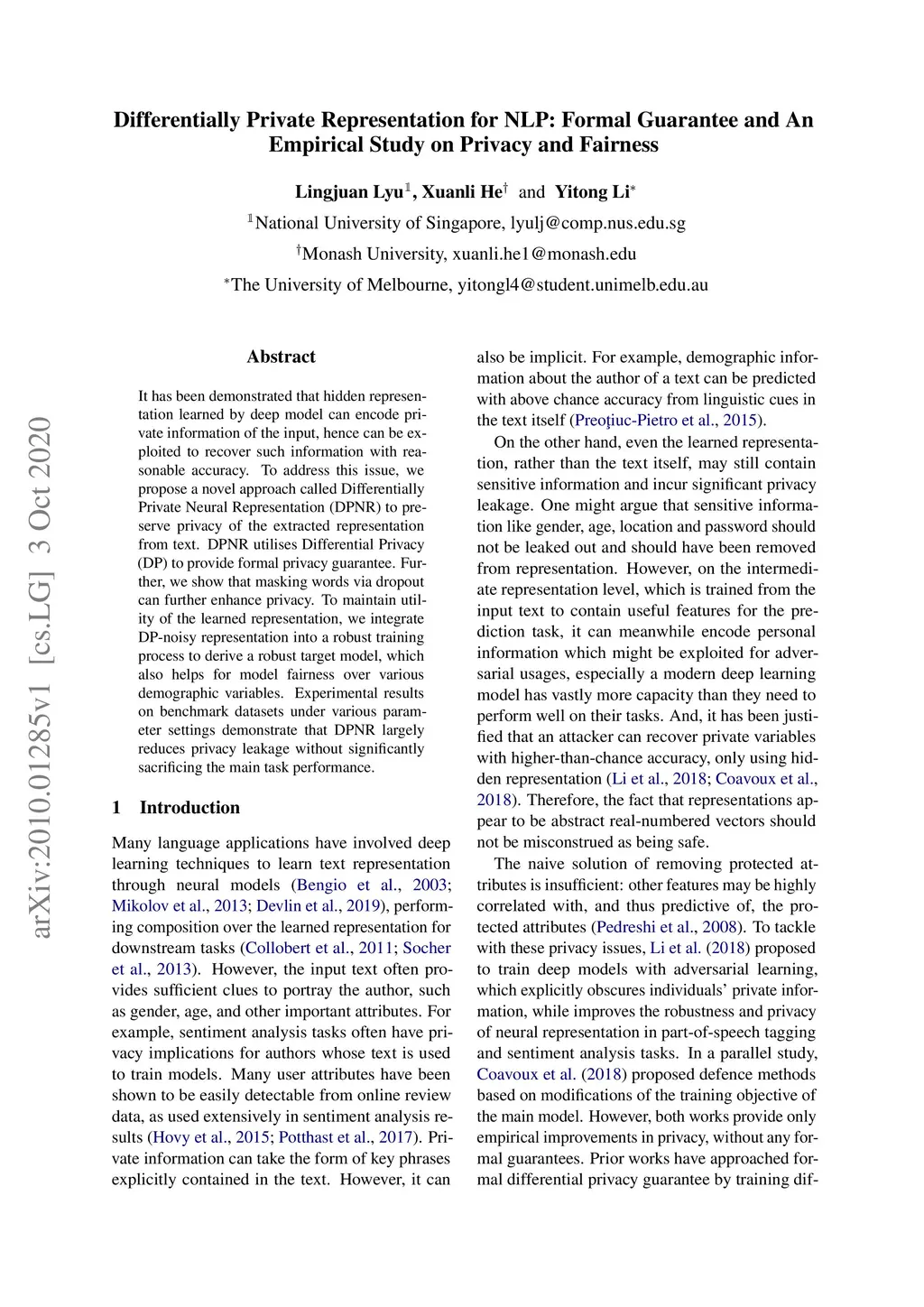 Differentially Private Representation for NLP: Formal Guarantee and An