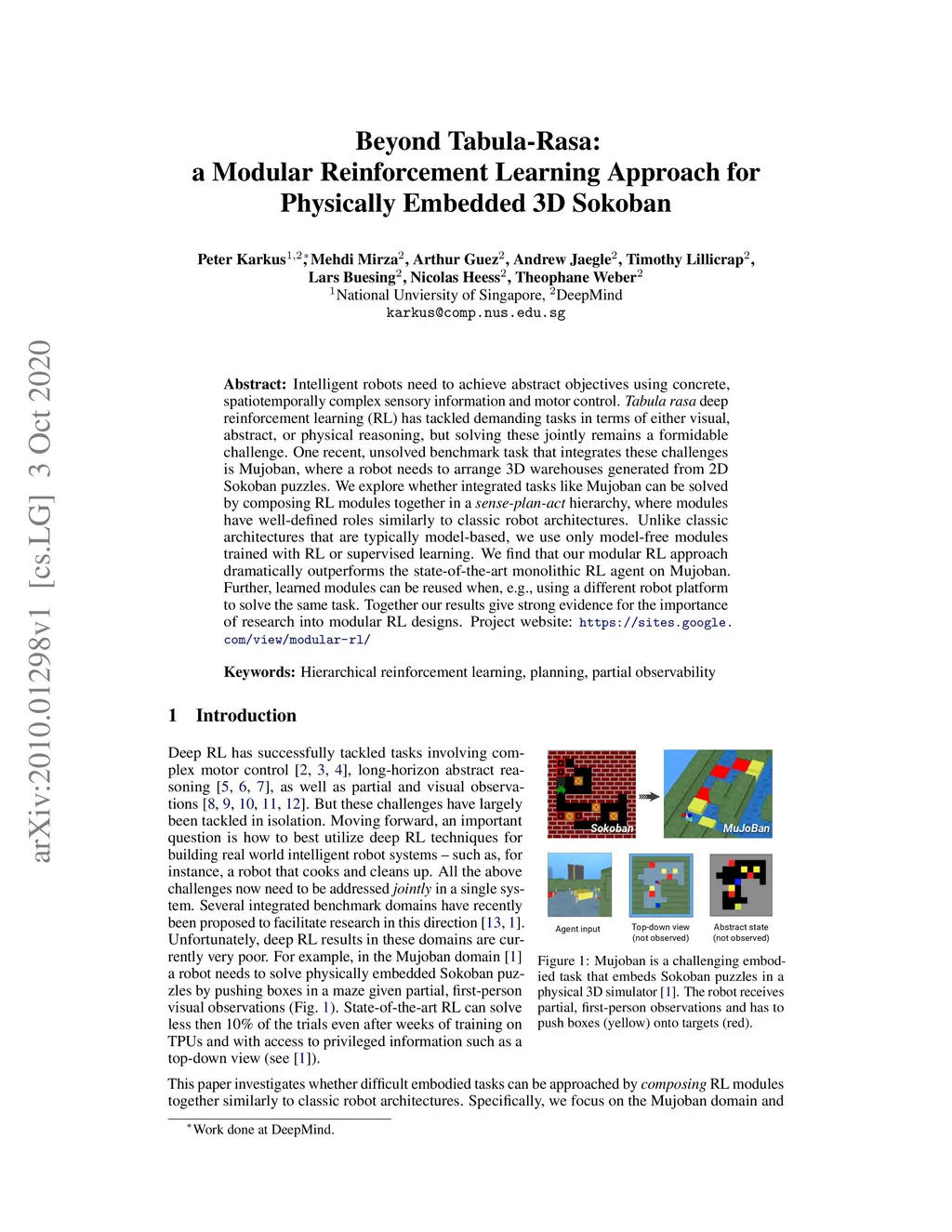 Intelligent robots need to achieve abstract objectives using concrete, spatiotemporally complex sensory information and motor control. Tabula rasa deep reinforcement learning (RL) has tackled demanding tasks in terms of either visual, abstract, or physical reasoning, but solving these jointly remains a formidable challenge. One recent, unsolved benchmark task that integrates these challenges is Mujoban, where a robot needs to arrange 3D warehouses generated from 2D Sokoban puzzles. We explore whether integrated tasks like Mujoban can be solved by composing RL modules together in a sense-plan-act hierarchy, where modules have well-defined roles similarly to classic robot architectures. Unlike classic architectures that are typically model-based, we use only model-free modules trained with RL or supervised learning. We find that our modular RL approach dramatically outperforms the state-of-the-art monolithic RL agent on Mujoban. Further, learned modules can be reused when, e.g., using a different robot platform to solve the same task. Together our results give strong evidence for the importance of research into modular RL designs. Project website: https://sites.google.com/view/modular-rl/
