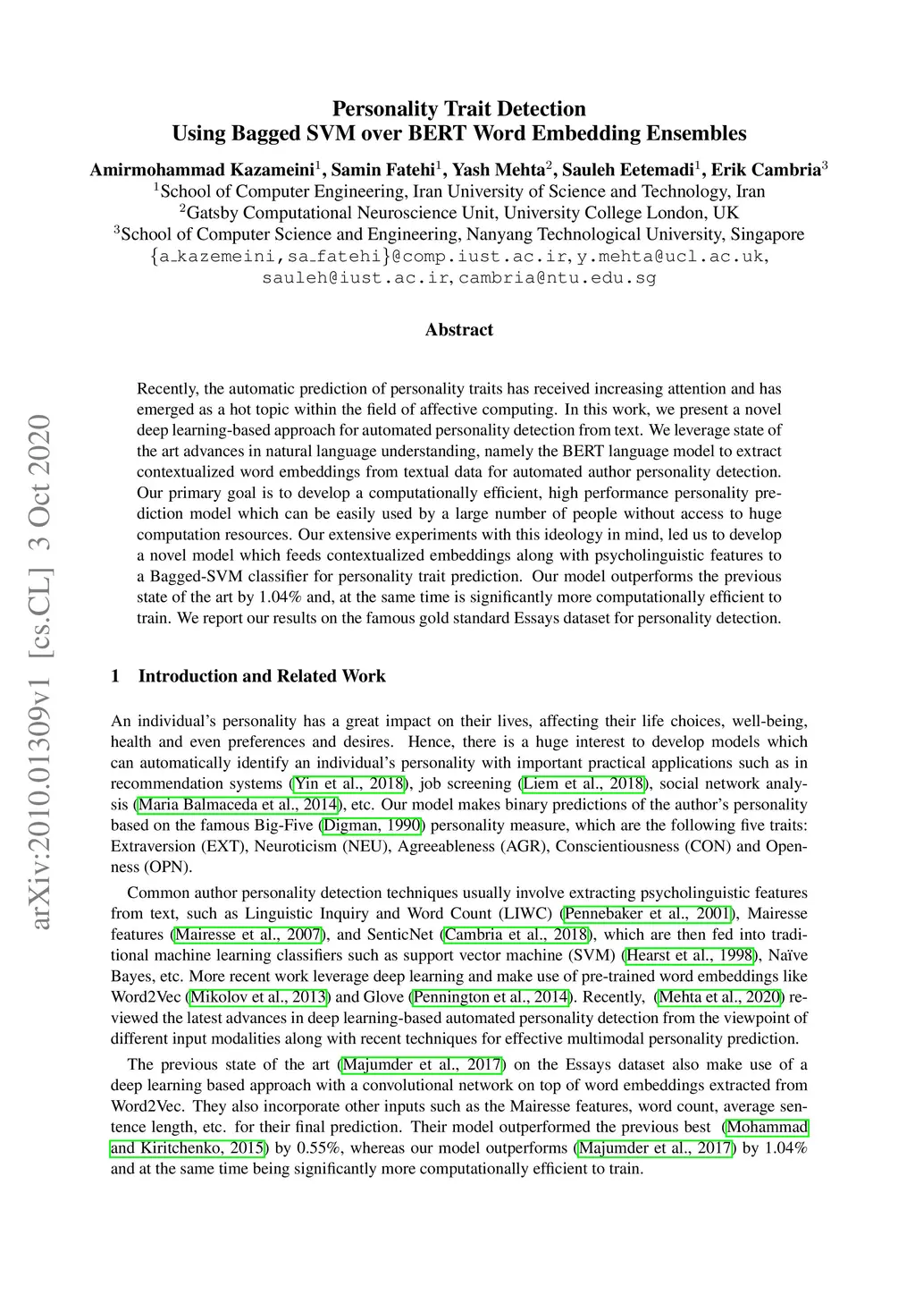 Personality Trait Detection Using Bagged SVM over BERT Word Embedding