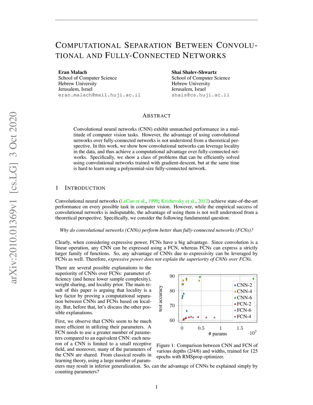 Convolutional neural networks (CNN) exhibit unmatched performance in a multitude of computer vision tasks. However, the advantage of using convolutional networks over fully-connected networks is not understood from a theoretical perspective. In this work, we show how convolutional networks can leverage locality in the data, and thus achieve a computational advantage over fully-connected networks. Specifically, we show a class of problems that can be efficiently solved using convolutional networks trained with gradient-descent, but at the same time is hard to learn using a polynomial-size fully-connected network.