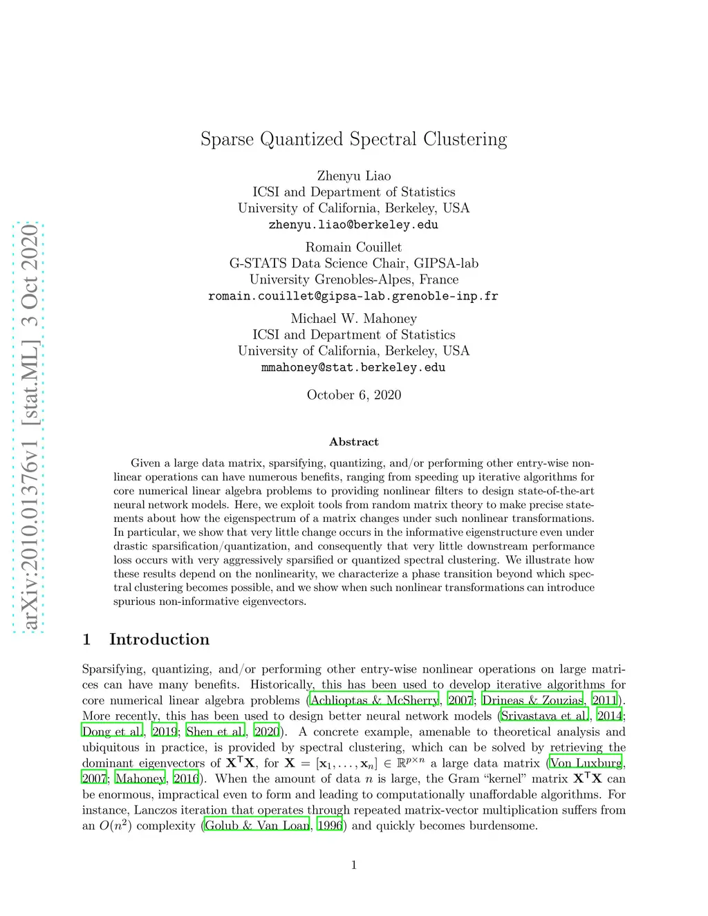 Given a large data matrix, sparsifying, quantizing, and/or performing other entry-wise nonlinear operations can have numerous benefits, ranging from speeding up iterative algorithms for core numerical linear algebra problems to providing nonlinear filters to design state-of-the-art neural network models. Here, we exploit tools from random matrix theory to make precise statements about how the eigenspectrum of a matrix changes under such nonlinear transformations. In particular, we show that very little change occurs in the informative eigenstructure even under drastic sparsification/quantization, and consequently that very little downstream performance loss occurs with very aggressively sparsified or quantized spectral clustering. We illustrate how these results depend on the nonlinearity, we characterize a phase transition beyond which spectral clustering becomes possible, and we show when such nonlinear transformations can introduce spurious non-informative eigenvectors.
