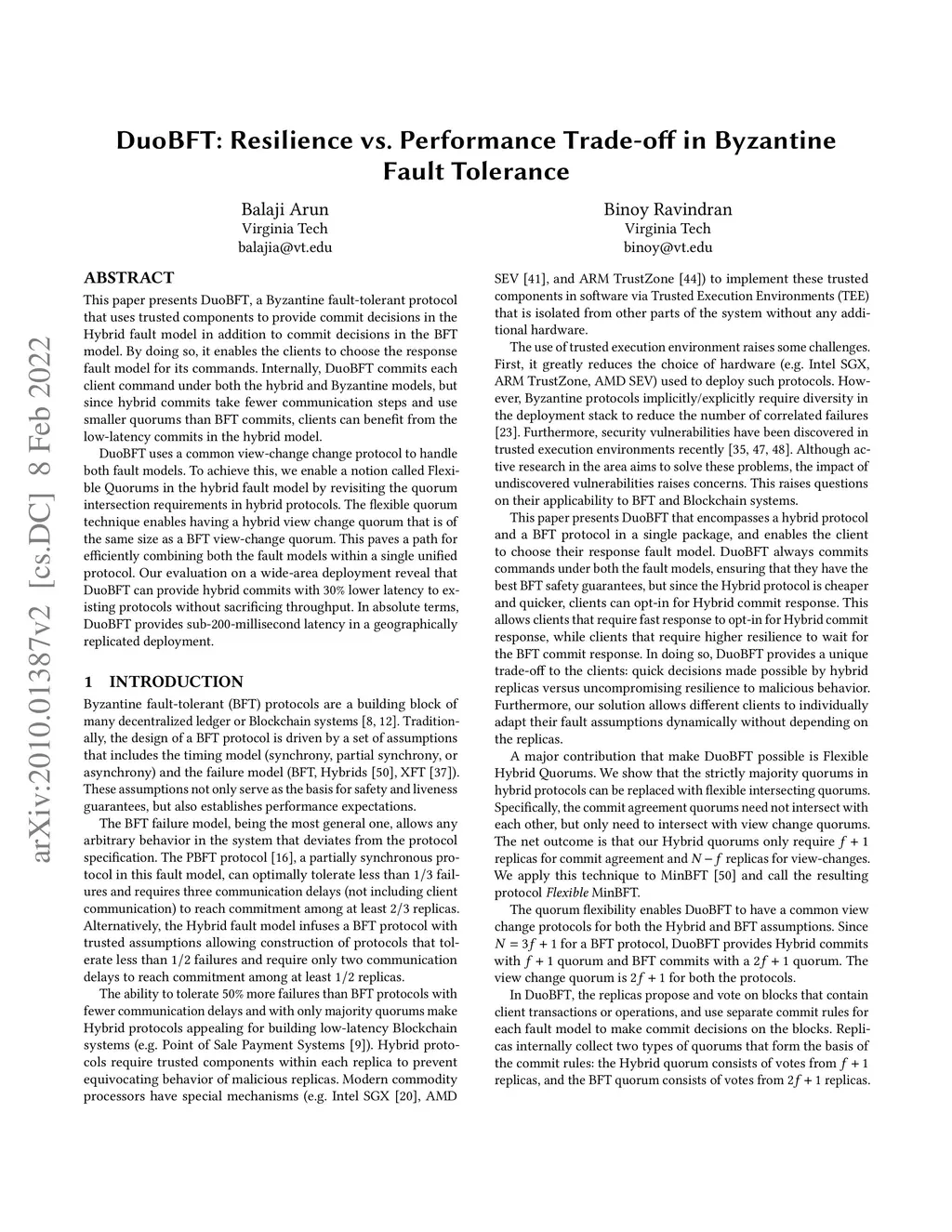 This paper presents DuoBFT, a Byzantine fault-tolerant protocol that uses trusted components to provide commit decisions in the Hybrid fault model in addition to commit decisions in the BFT model. By doing so, it enables the clients to choose the response fault model for its commands. Internally, DuoBFT commits each client command under both the hybrid and Byzantine models, but since hybrid commits take fewer communication steps and use smaller quorums than BFT commits, clients can benefit from the low-latency commits in the hybrid model. DuoBFT uses a common view-change change protocol to handle both fault models. To achieve this, we enable a notion called Flexible Quorums in the hybrid fault model by revisiting the quorum intersection requirements in hybrid protocols. The flexible quorum technique enables having a hybrid view change quorum that is of the same size as a BFT view-change quorum. This paves a path for efficiently combining both the fault models within a single unified protocol. Our evaluation on a wide-area deployment reveal that DuoBFT can provide hybrid commits with 30% lower latency to existing protocols without sacrificing throughput. In absolute terms, DuoBFT provides sub-200-millisecond latency in a geographically replicated deployment.