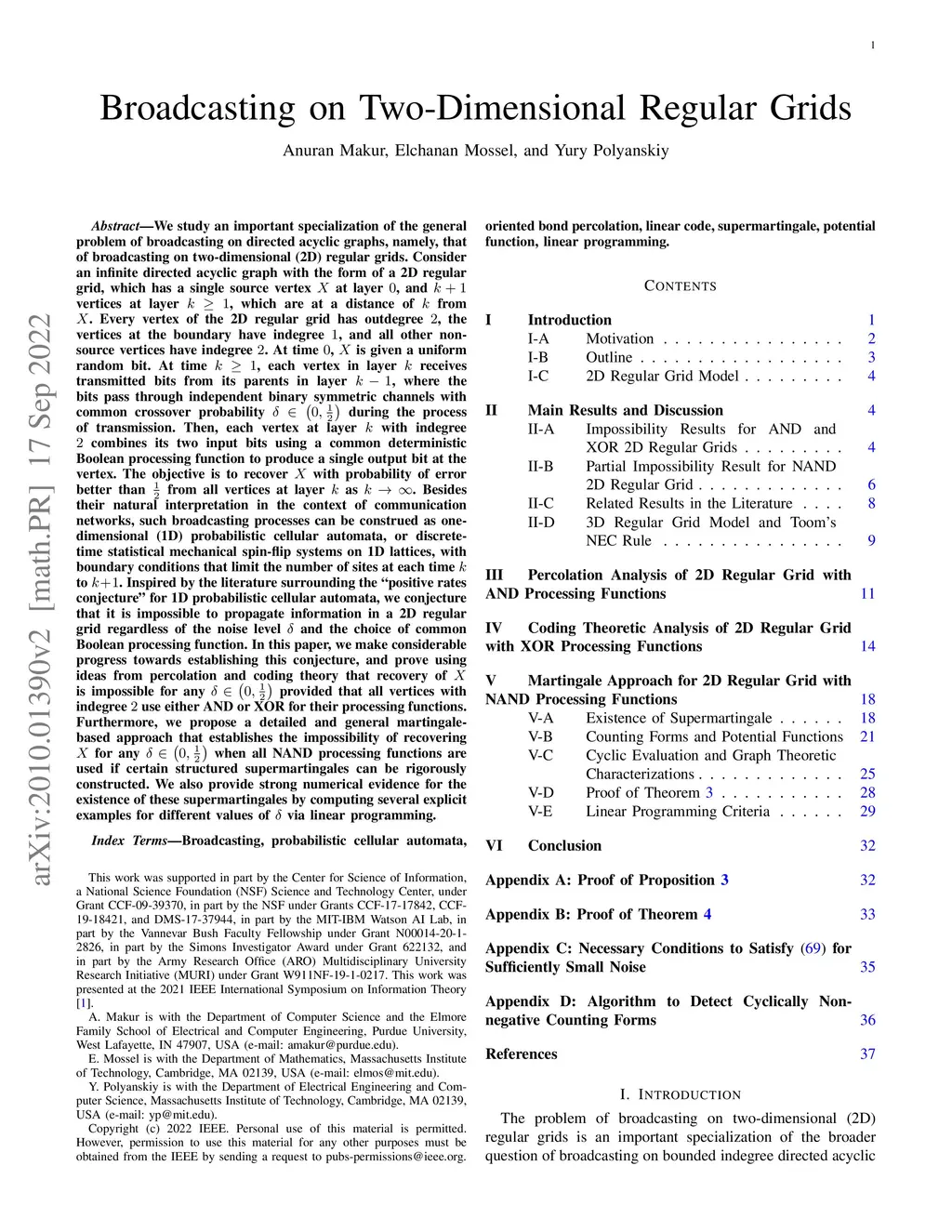 We study a specialization of the problem of broadcasting on directed acyclic graphs, namely, broadcasting on 2D regular grids. Consider a 2D regular grid with source vertex at layer and vertices at layer , which are at distance from . Every vertex of the 2D regular grid has outdegree , the vertices at the boundary have indegree , and all other vertices have indegree . At time , is given a random bit. At time , each vertex in layer receives transmitted bits from its parents in layer , where the bits pass through binary symmetric channels with noise level . Then, each vertex combines its received bits using a common Boolean processing function to produce an output bit. The objective is to recover with probability of error better than from all vertices at layer as . Besides their natural interpretation in communication networks, such broadcasting processes can be construed as 1D probabilistic cellular automata (PCA) with boundary conditions that limit the number of sites at each time to . We conjecture that it is impossible to propagate information in a 2D regular grid regardless of the noise level and the choice of processing function. In this paper, we make progress towards establishing this conjecture, and prove using ideas from percolation and coding theory that recovery of is impossible for any provided that all vertices use either AND or XOR processing functions. Furthermore, we propose a martingale-based approach that establishes the impossibility of recovering for any when all NAND processing functions are used if certain supermartingales can be rigorously constructed. We also provide numerical evidence for the existence of these supermartingales by computing explicit examples for different values of via linear programming.