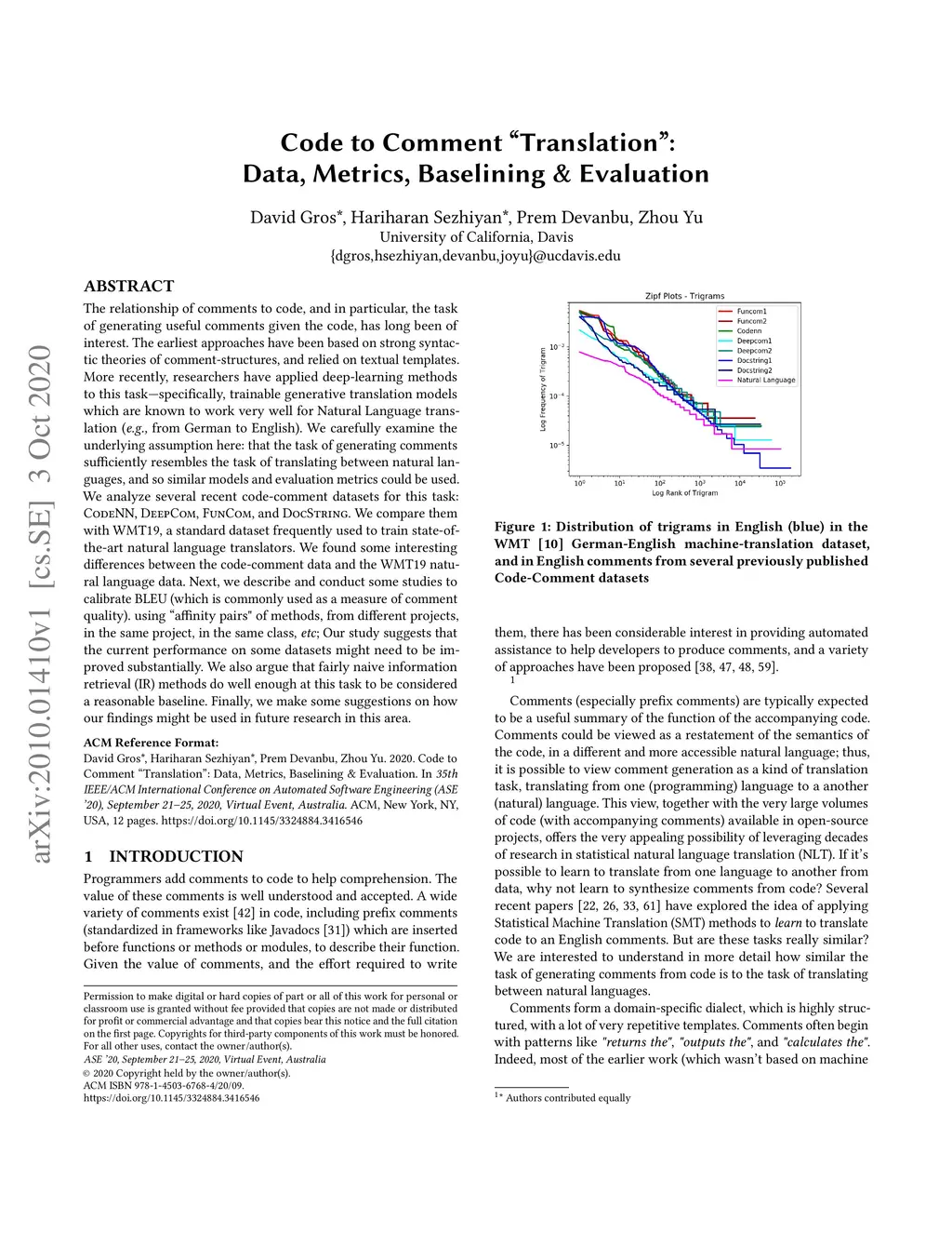 Code to Comment "Translation": Data, Metrics, Baselining & Evaluation