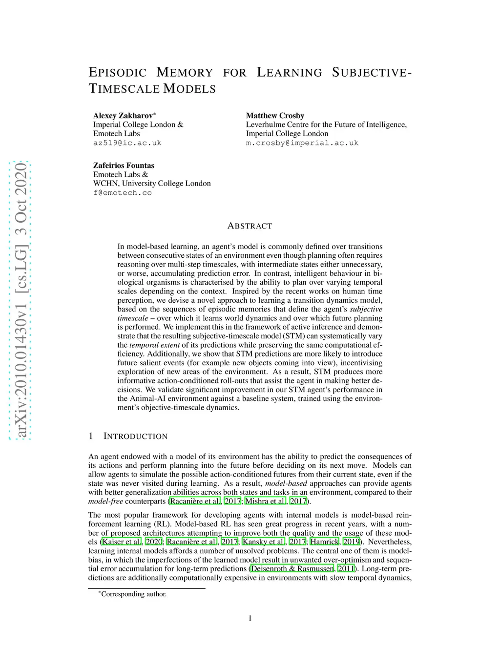 In model-based learning, an agent's model is commonly defined over transitions between consecutive states of an environment even though planning often requires reasoning over multi-step timescales, with intermediate states either unnecessary, or worse, accumulating prediction error. In contrast, intelligent behaviour in biological organisms is characterised by the ability to plan over varying temporal scales depending on the context. Inspired by the recent works on human time perception, we devise a novel approach to learning a transition dynamics model, based on the sequences of episodic memories that define the agent's subjective timescale - over which it learns world dynamics and over which future planning is performed. We implement this in the framework of active inference and demonstrate that the resulting subjective-timescale model (STM) can systematically vary the temporal extent of its predictions while preserving the same computational efficiency. Additionally, we show that STM predictions are more likely to introduce future salient events (for example new objects coming into view), incentivising exploration of new areas of the environment. As a result, STM produces more informative action-conditioned roll-outs that assist the agent in making better decisions. We validate significant improvement in our STM agent's performance in the Animal-AI environment against a baseline system, trained using the environment's objective-timescale dynamics.