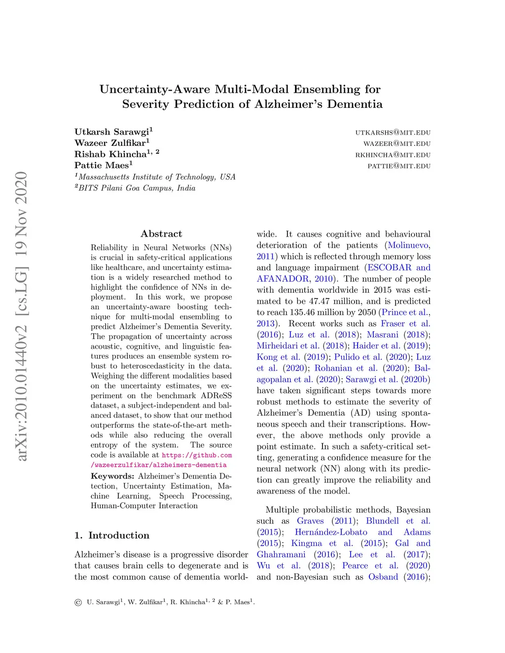 Reliability in Neural Networks (NNs) is crucial in safety-critical applications like healthcare, and uncertainty estimation is a widely researched method to highlight the confidence of NNs in deployment. In this work, we propose an uncertainty-aware boosting technique for multi-modal ensembling to predict Alzheimer's Dementia Severity. The propagation of uncertainty across acoustic, cognitive, and linguistic features produces an ensemble system robust to heteroscedasticity in the data. Weighing the different modalities based on the uncertainty estimates, we experiment on the benchmark ADReSS dataset, a subject-independent and balanced dataset, to show that our method outperforms the state-of-the-art methods while also reducing the overall entropy of the system. This work aims to encourage fair and aware models. The source code is available at https://github.com/wazeerzulfikar/alzheimers-dementia