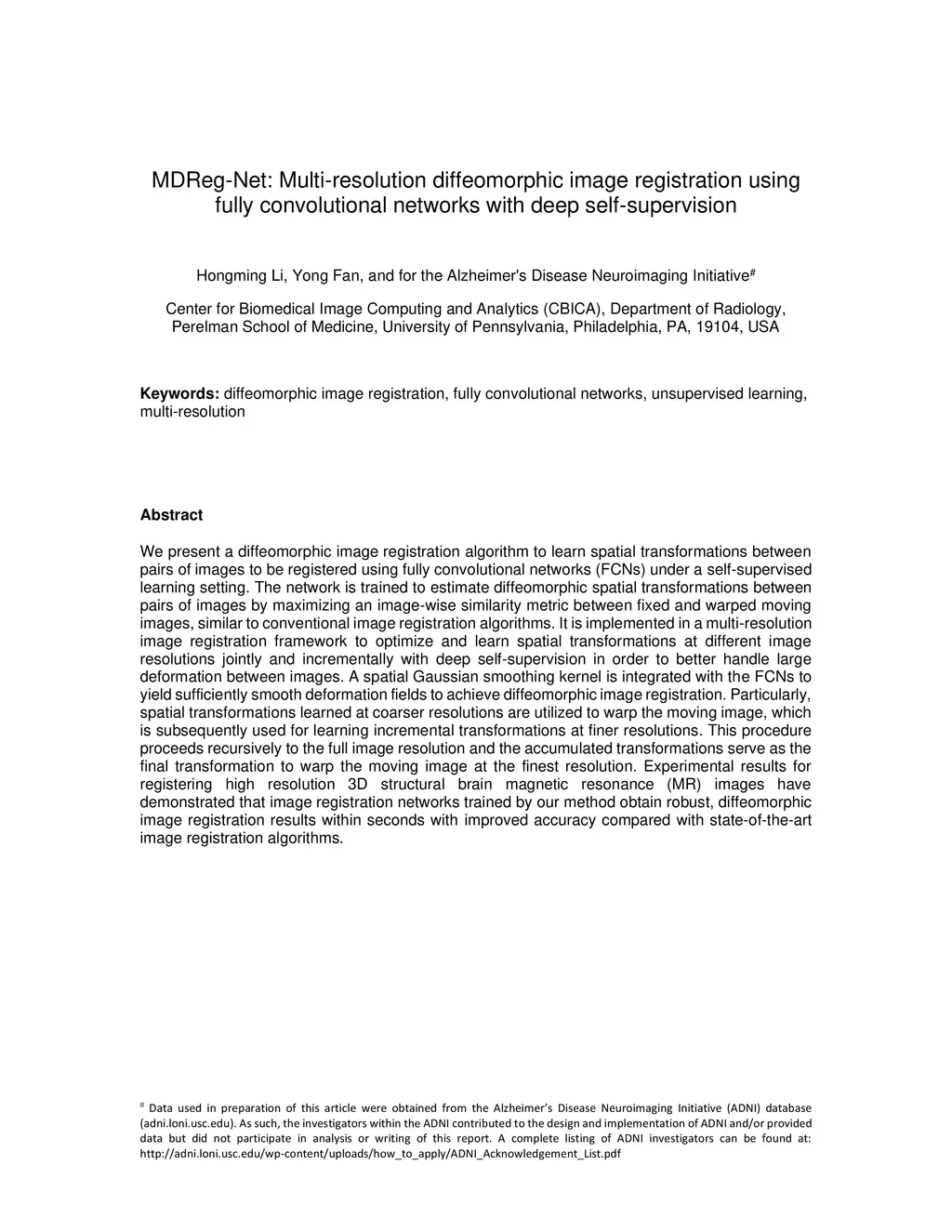 MDReg-Net: Multi-resolution diffeomorphic image registration using fully