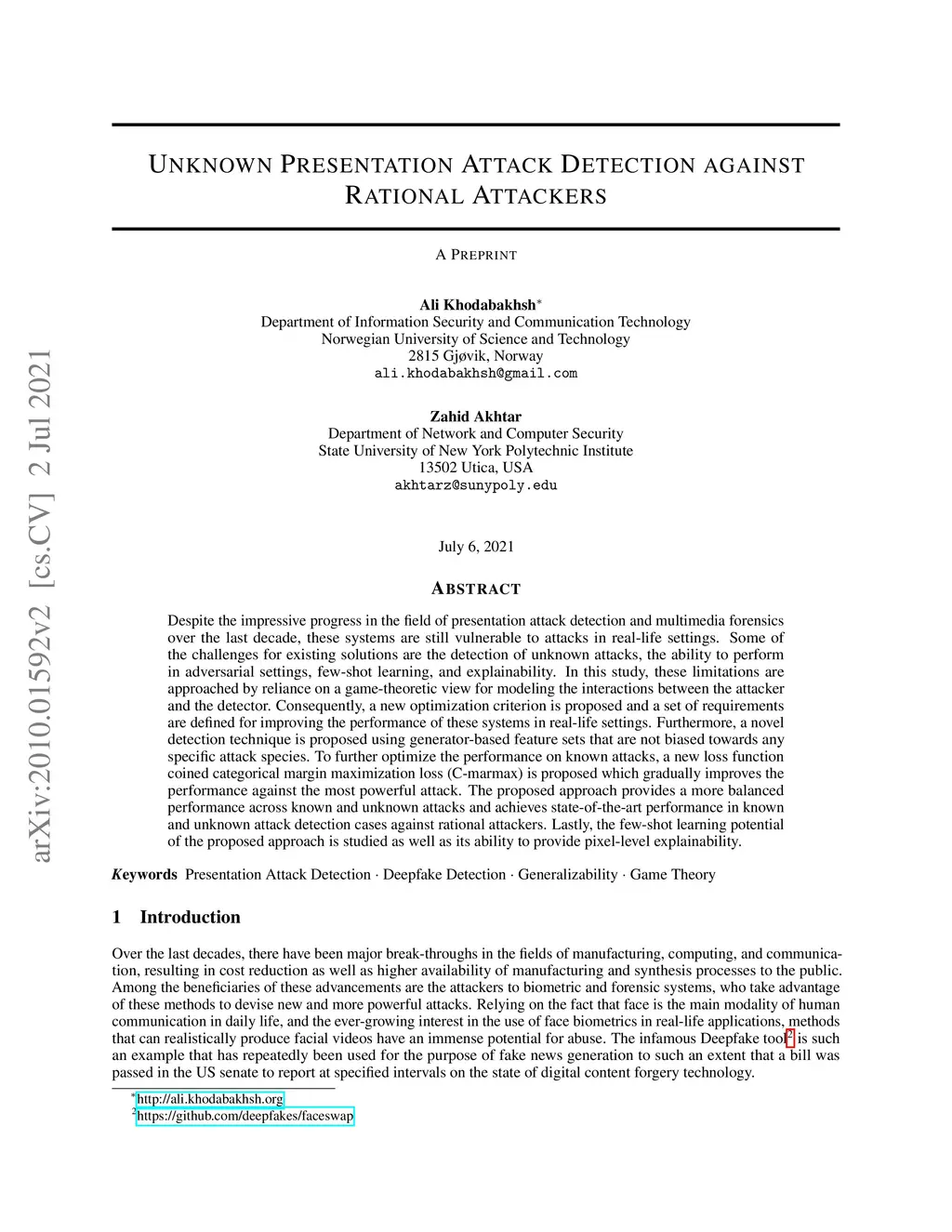 Despite the impressive progress in the field of presentation attack detection and multimedia forensics over the last decade, these systems are still vulnerable to attacks in real-life settings. Some of the challenges for existing solutions are the detection of unknown attacks, the ability to perform in adversarial settings, few-shot learning, and explainability. In this study, these limitations are approached by reliance on a game-theoretic view for modeling the interactions between the attacker and the detector. Consequently, a new optimization criterion is proposed and a set of requirements are defined for improving the performance of these systems in real-life settings. Furthermore, a novel detection technique is proposed using generator-based feature sets that are not biased towards any specific attack species. To further optimize the performance on known attacks, a new loss function coined categorical margin maximization loss (C-marmax) is proposed which gradually improves the performance against the most powerful attack. The proposed approach provides a more balanced performance across known and unknown attacks and achieves state-of-the-art performance in known and unknown attack detection cases against rational attackers. Lastly, the few-shot learning potential of the proposed approach is studied as well as its ability to provide pixel-level explainability.