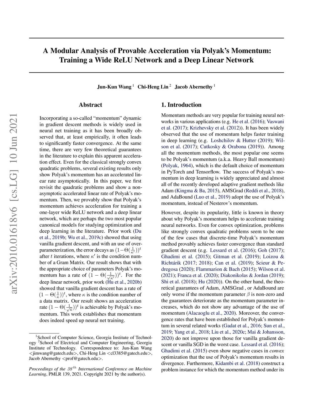 Incorporating a so-called "momentum" dynamic in gradient descent methods is widely used in neural net training as it has been broadly observed that, at least empirically, it often leads to significantly faster convergence. At the same time, there are very few theoretical guarantees in the literature to explain this apparent acceleration effect. Even for the classical strongly convex quadratic problems, several existing results only show Polyak's momentum has an accelerated linear rate asymptotically. In this paper, we first revisit the quadratic problems and show a non-asymptotic accelerated linear rate of Polyak's momentum. Then, we provably show that Polyak's momentum achieves acceleration for training a one-layer wide ReLU network and a deep linear network, which are perhaps the two most popular canonical models for studying optimization and deep learning in the literature. Prior work Du at al. 2019 and Wu et al. 2019 showed that using vanilla gradient descent, and with an use of over-parameterization, the error decays as after iterations, where is the condition number of a Gram Matrix. Our result shows that with the appropriate choice of parameters Polyak's momentum has a rate of . For the deep linear network, prior work Hu et al. 2020 showed that vanilla gradient descent has a rate of , where is the condition number of a data matrix. Our result shows an acceleration rate is achievable by Polyak's momentum. All the results in this work are obtained from a modular analysis, which can be of independent interest. This work establishes that momentum does indeed speed up neural net training.