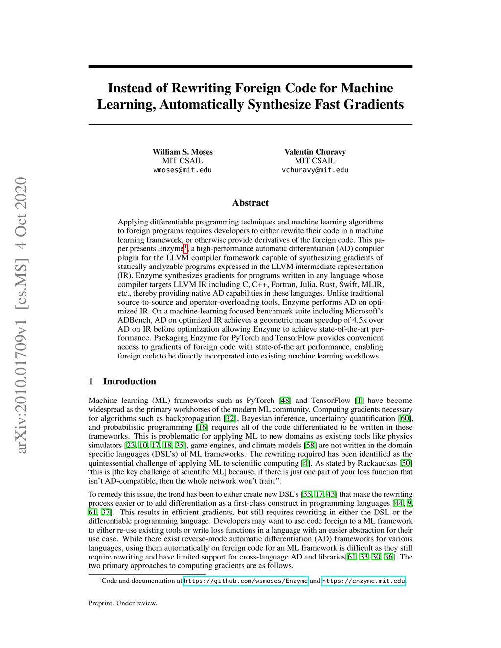 Applying differentiable programming techniques and machine learning algorithms to foreign programs requires developers to either rewrite their code in a machine learning framework, or otherwise provide derivatives of the foreign code. This paper presents Enzyme, a high-performance automatic differentiation (AD) compiler plugin for the LLVM compiler framework capable of synthesizing gradients of statically analyzable programs expressed in the LLVM intermediate representation (IR). Enzyme synthesizes gradients for programs written in any language whose compiler targets LLVM IR including C, C++, Fortran, Julia, Rust, Swift, MLIR, etc., thereby providing native AD capabilities in these languages. Unlike traditional source-to-source and operator-overloading tools, Enzyme performs AD on optimized IR. On a machine-learning focused benchmark suite including Microsoft's ADBench, AD on optimized IR achieves a geometric mean speedup of 4.5x over AD on IR before optimization allowing Enzyme to achieve state-of-the-art performance. Packaging Enzyme for PyTorch and TensorFlow provides convenient access to gradients of foreign code with state-of-the art performance, enabling foreign code to be directly incorporated into existing machine learning workflows.