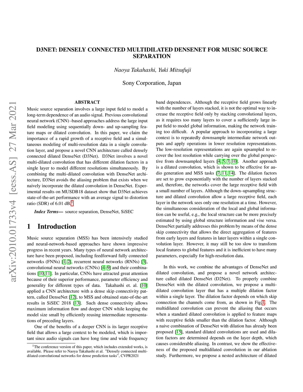 Music source separation involves a large input field to model a long-term dependence of an audio signal. Previous convolutional neural network (CNN)-based approaches address the large input field modeling using sequentially down- and up-sampling feature maps or dilated convolution. In this paper, we claim the importance of a rapid growth of a receptive field and a simultaneous modeling of multi-resolution data in a single convolution layer, and propose a novel CNN architecture called densely connected dilated DenseNet (D3Net). D3Net involves a novel multi-dilated convolution that has different dilation factors in a single layer to model different resolutions simultaneously. By combining the multi-dilated convolution with DenseNet architecture, D3Net avoids the aliasing problem that exists when we naively incorporate the dilated convolution in DenseNet. Experimental results on MUSDB18 dataset show that D3Net achieves state-of-the-art performance with an average signal to distortion ratio (SDR) of 6.01 dB.