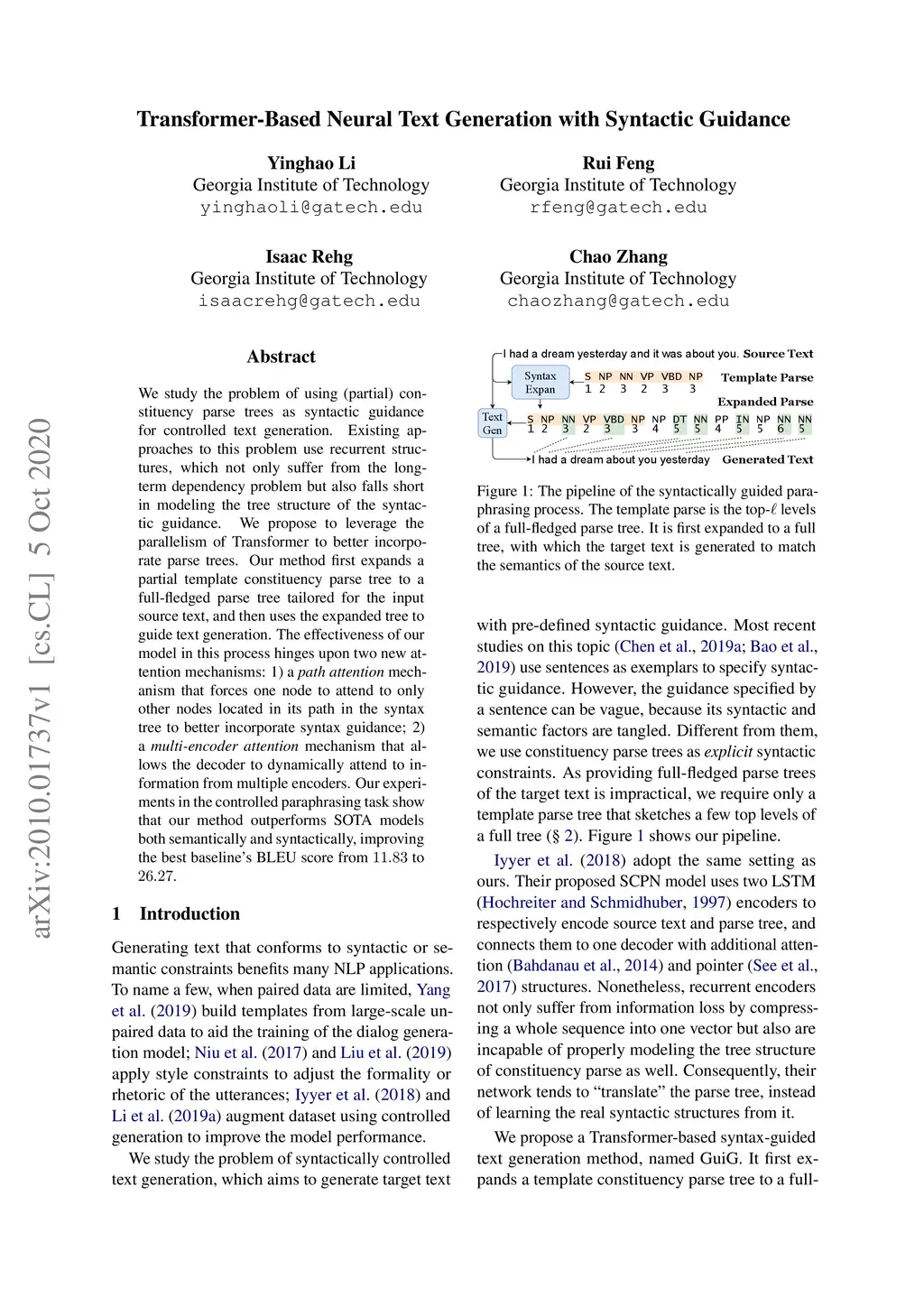 We study the problem of using (partial) constituency parse trees as syntactic guidance for controlled text generation. Existing approaches to this problem use recurrent structures, which not only suffer from the long-term dependency problem but also falls short in modeling the tree structure of the syntactic guidance. We propose to leverage the parallelism of Transformer to better incorporate parse trees. Our method first expands a partial template constituency parse tree to a full-fledged parse tree tailored for the input source text, and then uses the expanded tree to guide text generation. The effectiveness of our model in this process hinges upon two new attention mechanisms: 1) a path attention mechanism that forces one node to attend to only other nodes located in its path in the syntax tree to better incorporate syntax guidance; 2) a multi-encoder attention mechanism that allows the decoder to dynamically attend to information from multiple encoders. Our experiments in the controlled paraphrasing task show that our method outperforms SOTA models both semantically and syntactically, improving the best baseline's BLEU score from 11.83 to 26.27.