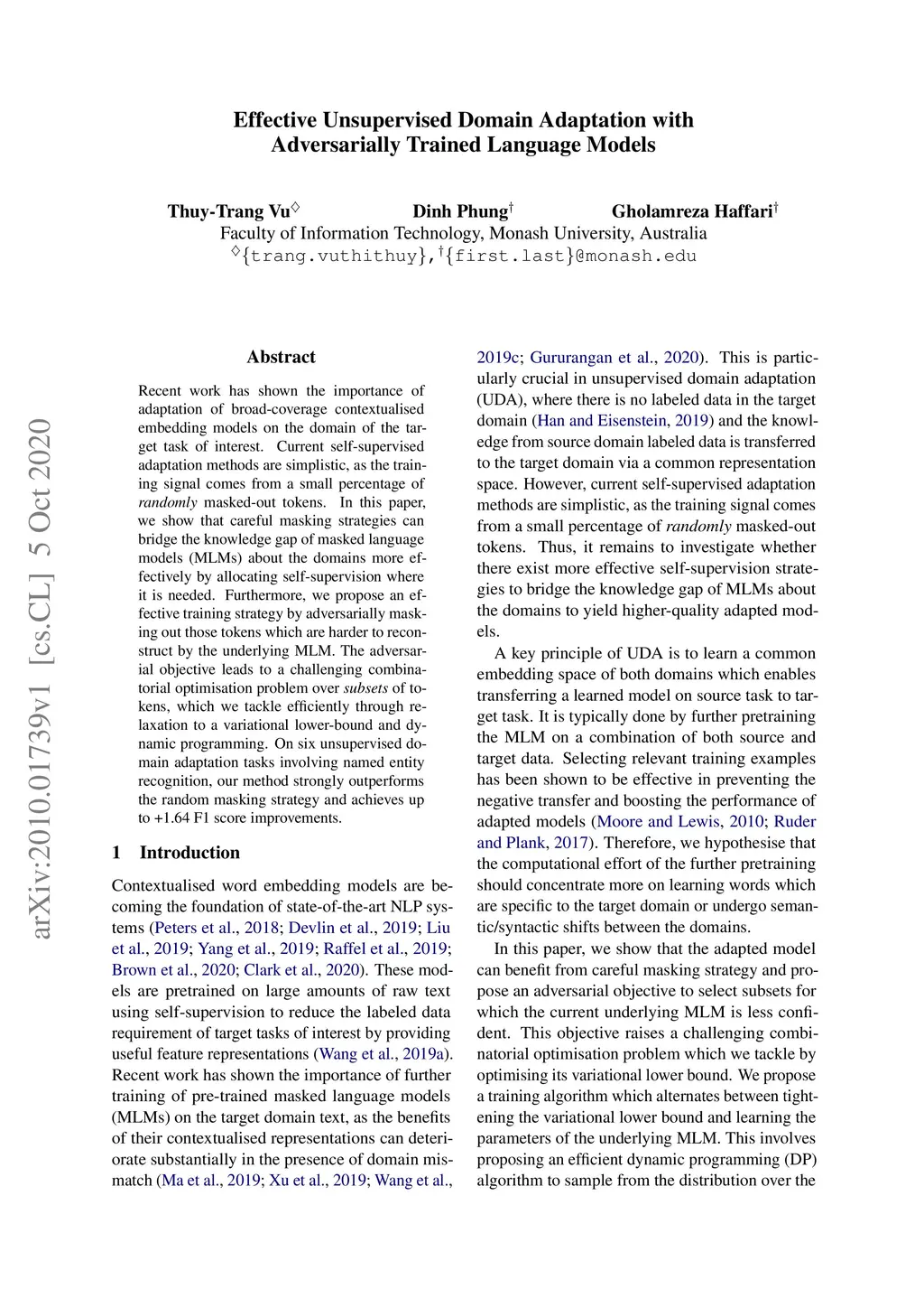 Recent work has shown the importance of adaptation of broad-coverage contextualised embedding models on the domain of the target task of interest. Current self-supervised adaptation methods are simplistic, as the training signal comes from a small percentage of \emph{randomly} masked-out tokens. In this paper, we show that careful masking strategies can bridge the knowledge gap of masked language models (MLMs) about the domains more effectively by allocating self-supervision where it is needed. Furthermore, we propose an effective training strategy by adversarially masking out those tokens which are harder to reconstruct by the underlying MLM. The adversarial objective leads to a challenging combinatorial optimisation problem over \emph{subsets} of tokens, which we tackle efficiently through relaxation to a variational lowerbound and dynamic programming. On six unsupervised domain adaptation tasks involving named entity recognition, our method strongly outperforms the random masking strategy and achieves up to +1.64 F1 score improvements.