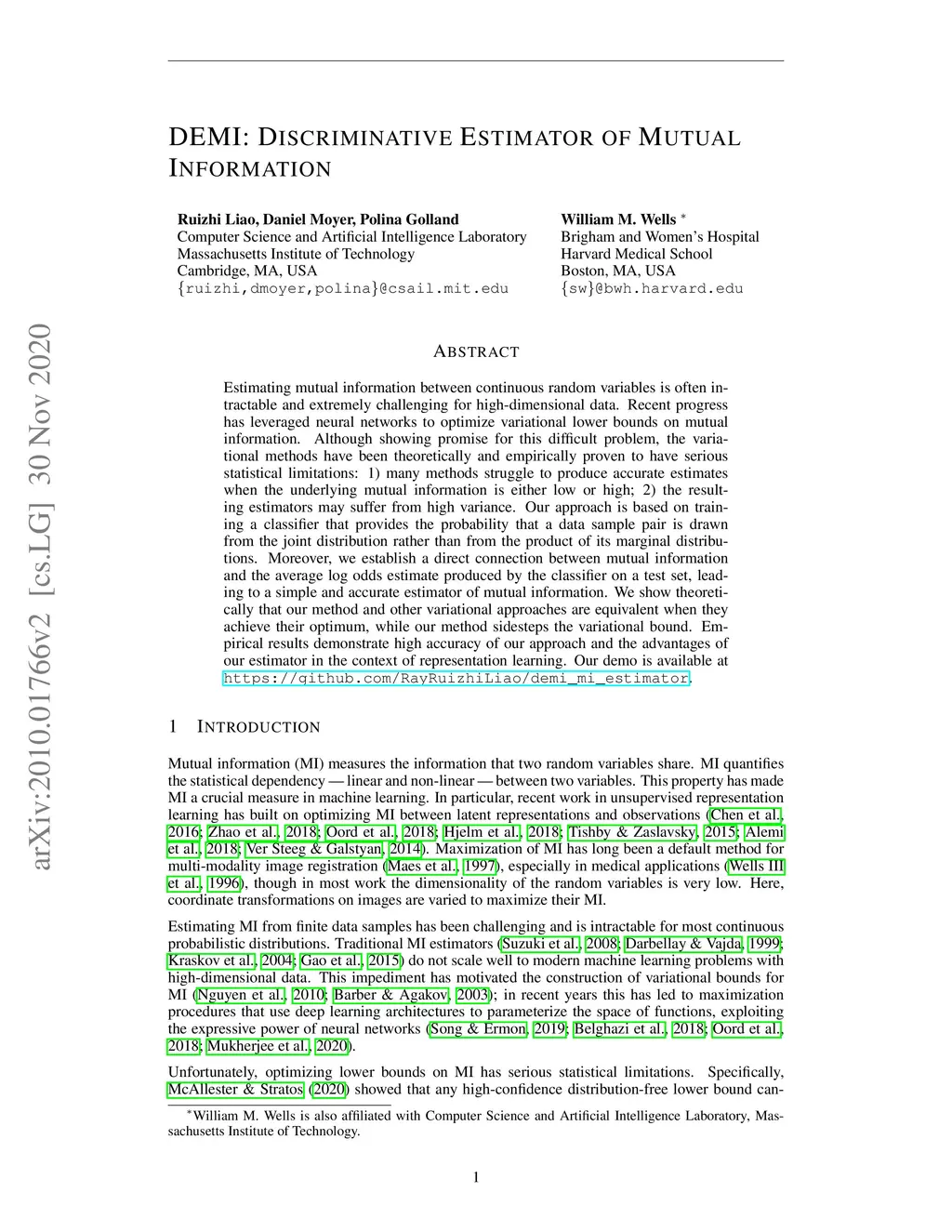 Estimating mutual information between continuous random variables is often intractable and extremely challenging for high-dimensional data. Recent progress has leveraged neural networks to optimize variational lower bounds on mutual information. Although showing promise for this difficult problem, the variational methods have been theoretically and empirically proven to have serious statistical limitations: 1) many methods struggle to produce accurate estimates when the underlying mutual information is either low or high; 2) the resulting estimators may suffer from high variance. Our approach is based on training a classifier that provides the probability that a data sample pair is drawn from the joint distribution rather than from the product of its marginal distributions. Moreover, we establish a direct connection between mutual information and the average log odds estimate produced by the classifier on a test set, leading to a simple and accurate estimator of mutual information. We show theoretically that our method and other variational approaches are equivalent when they achieve their optimum, while our method sidesteps the variational bound. Empirical results demonstrate high accuracy of our approach and the advantages of our estimator in the context of representation learning. Our demo is available at https://github.com/RayRuizhiLiao/demi_mi_estimator.