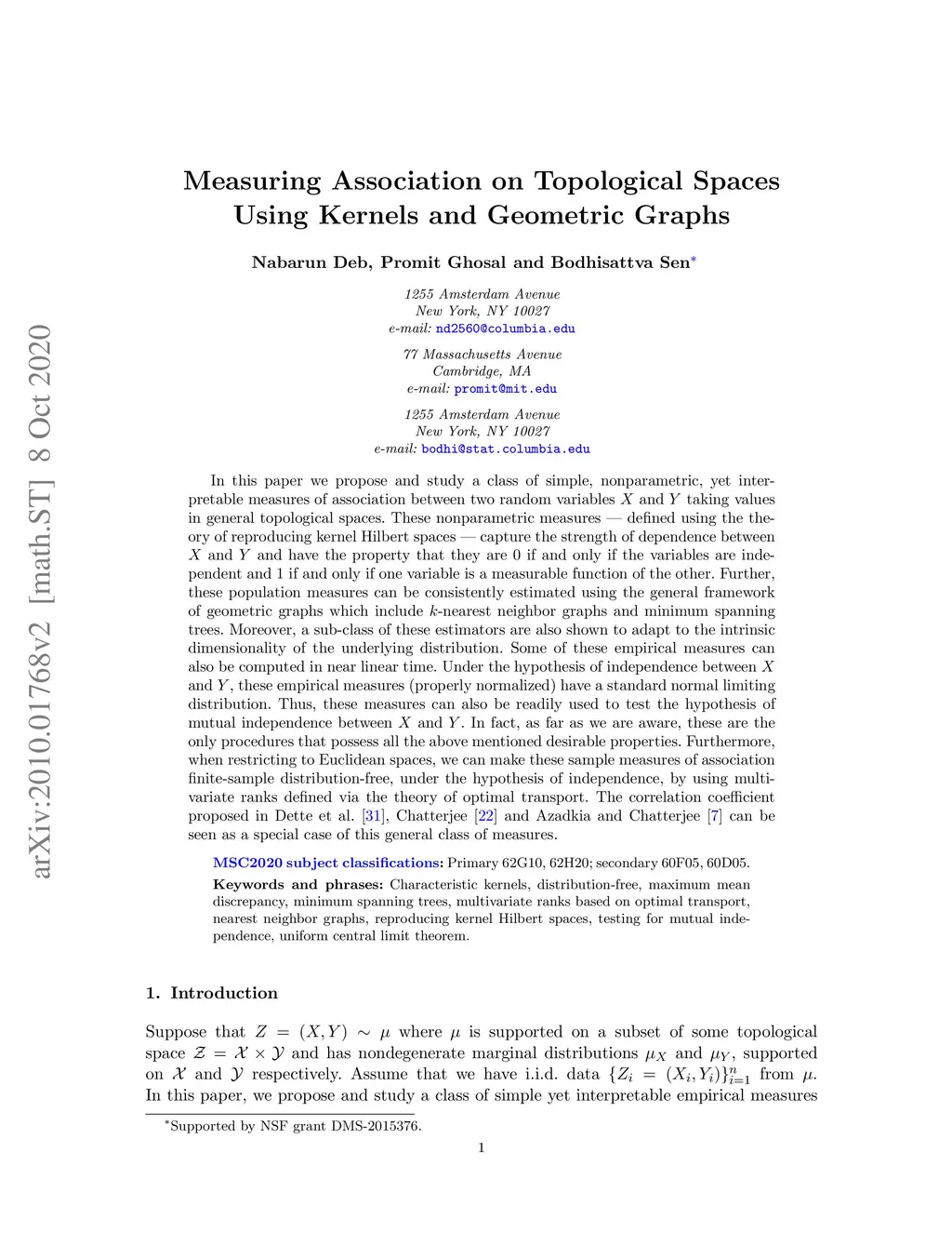 In this paper we propose and study a class of simple, nonparametric, yet interpretable measures of association between two random variables and taking values in general topological spaces. These nonparametric measures -- defined using the theory of reproducing kernel Hilbert spaces -- capture the strength of dependence between and and have the property that they are 0 if and only if the variables are independent and 1 if and only if one variable is a measurable function of the other. Further, these population measures can be consistently estimated using the general framework of graph functionals which include -nearest neighbor graphs and minimum spanning trees. Moreover, a sub-class of these estimators are also shown to adapt to the intrinsic dimensionality of the underlying distribution. Some of these empirical measures can also be computed in near linear time. Under the hypothesis of independence between and , these empirical measures (properly normalized) have a standard normal limiting distribution. Thus, these measures can also be readily used to test the hypothesis of mutual independence between and . In fact, as far as we are aware, these are the only procedures that possess all the above mentioned desirable properties. Furthermore, when restricting to Euclidean spaces, we can make these sample measures of association finite-sample distribution-free, under the hypothesis of independence, by using multivariate ranks defined via the theory of optimal transport. The recent correlation coefficient proposed in Dette et al. (2013), Chatterjee (2019), and Azadkia and Chatterjee (2019) can be seen as a special case of this general class of measures.