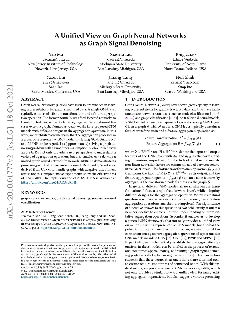 Graph Neural Networks (GNNs) have risen to prominence in learning representations for graph structured data. A single GNN layer typically consists of a feature transformation and a feature aggregation operation. The former normally uses feed-forward networks to transform features, while the latter aggregates the transformed features over the graph. Numerous recent works have proposed GNN models with different designs in the aggregation operation. In this work, we establish mathematically that the aggregation processes in a group of representative GNN models including GCN, GAT, PPNP, and APPNP can be regarded as (approximately) solving a graph denoising problem with a smoothness assumption. Such a unified view across GNNs not only provides a new perspective to understand a variety of aggregation operations but also enables us to develop a unified graph neural network framework UGNN. To demonstrate its promising potential, we instantiate a novel GNN model, ADA-UGNN, derived from UGNN, to handle graphs with adaptive smoothness across nodes. Comprehensive experiments show the effectiveness of ADA-UGNN.