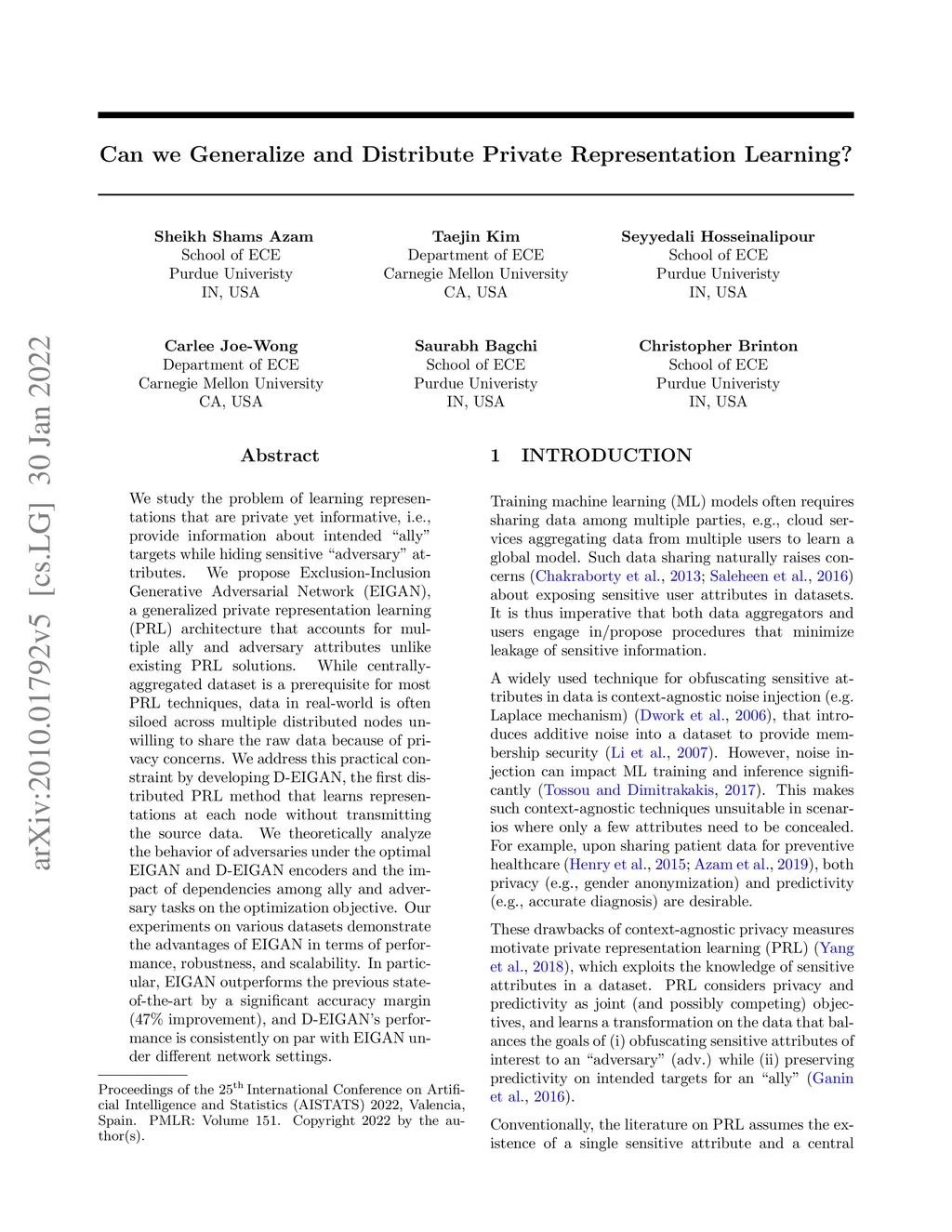 We study the problem of learning representations that are private yet informative, i.e., provide information about intended "ally" targets while hiding sensitive "adversary" attributes. We propose Exclusion-Inclusion Generative Adversarial Network (EIGAN), a generalized private representation learning (PRL) architecture that accounts for multiple ally and adversary attributes unlike existing PRL solutions. While centrally-aggregated dataset is a prerequisite for most PRL techniques, data in real-world is often siloed across multiple distributed nodes unwilling to share the raw data because of privacy concerns. We address this practical constraint by developing D-EIGAN, the first distributed PRL method that learns representations at each node without transmitting the source data. We theoretically analyze the behavior of adversaries under the optimal EIGAN and D-EIGAN encoders and the impact of dependencies among ally and adversary tasks on the optimization objective. Our experiments on various datasets demonstrate the advantages of EIGAN in terms of performance, robustness, and scalability. In particular, EIGAN outperforms the previous state-of-the-art by a significant accuracy margin (47% improvement), and D-EIGAN's performance is consistently on par with EIGAN under different network settings.