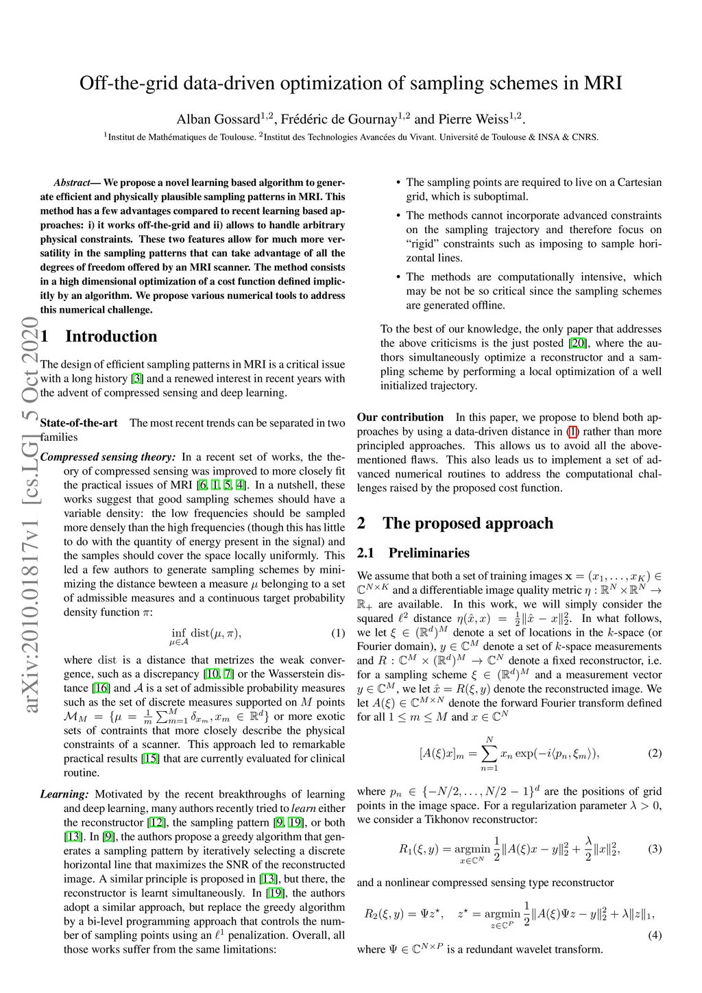 We propose a novel learning based algorithm to generate efficient and physically plausible sampling patterns in MRI. This method has a few advantages compared to recent learning based approaches: i) it works off-the-grid and ii) allows to handle arbitrary physical constraints. These two features allow for much more versatility in the sampling patterns that can take advantage of all the degrees of freedom offered by an MRI scanner. The method consists in a high dimensional optimization of a cost function defined implicitly by an algorithm. We propose various numerical tools to address this numerical challenge.