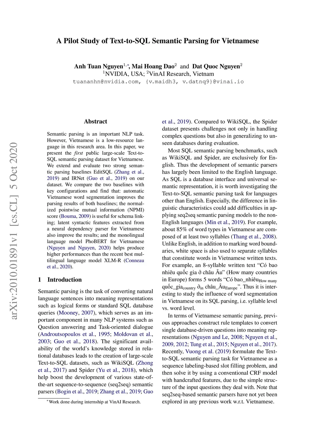 A Pilot Study of Text-to-SQL Semantic Parsing for Vietnamese