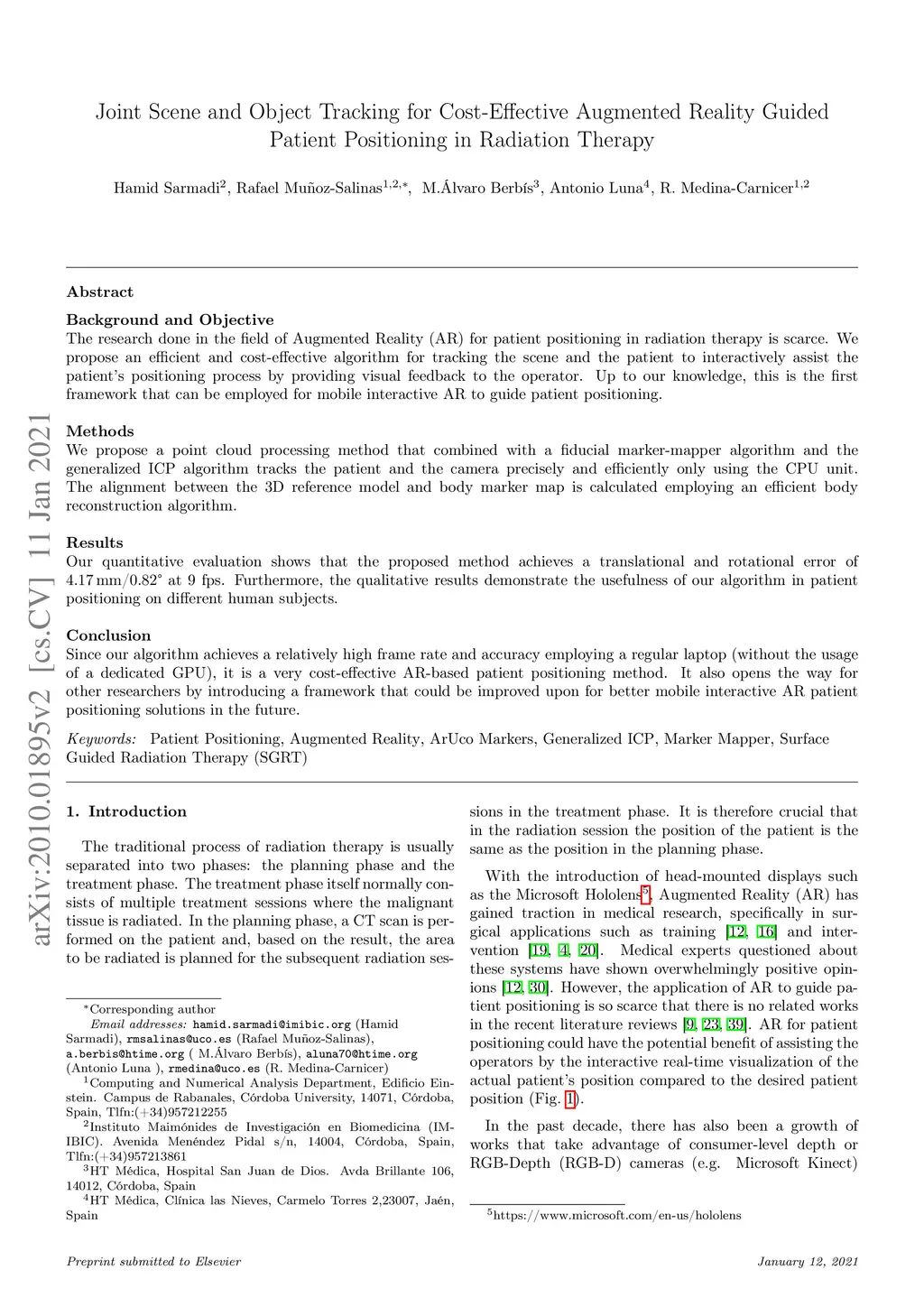 BACKGROUND AND OBJECTIVE: The research done in the field of Augmented Reality (AR) for patient positioning in radiation therapy is scarce. We propose an efficient and cost-effective algorithm for tracking the scene and the patient to interactively assist the patient's positioning process by providing visual feedback to the operator. Up to our knowledge, this is the first framework that can be employed for mobile interactive AR to guide patient positioning. METHODS: We propose a point cloud processing method that combined with a fiducial marker-mapper algorithm and the generalized ICP algorithm tracks the patient and the camera precisely and efficiently only using the CPU unit. The alignment between the 3D reference model and body marker map is calculated employing an efficient body reconstruction algorithm. RESULTS: Our quantitative evaluation shows that the proposed method achieves a translational and rotational error of 4.17 mm/0.82 deg at 9 fps. Furthermore, the qualitative results demonstrate the usefulness of our algorithm in patient positioning on different human subjects. CONCLUSION: Since our algorithm achieves a relatively high frame rate and accuracy employing a regular laptop (without the usage of a dedicated GPU), it is a very cost-effective AR-based patient positioning method. It also opens the way for other researchers by introducing a framework that could be improved upon for better mobile interactive AR patient positioning solutions in the future.