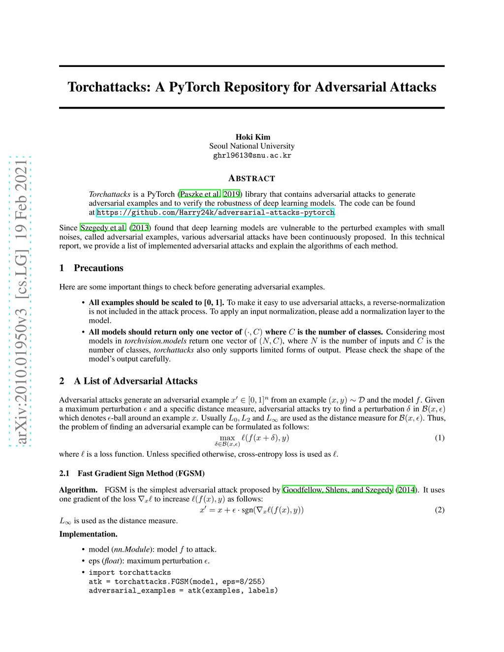 Torchattacks is a PyTorch library that contains adversarial attacks to generate adversarial examples and to verify the robustness of deep learning models. The code can be found at https://github.com/Harry24k/adversarial-attacks-pytorch.