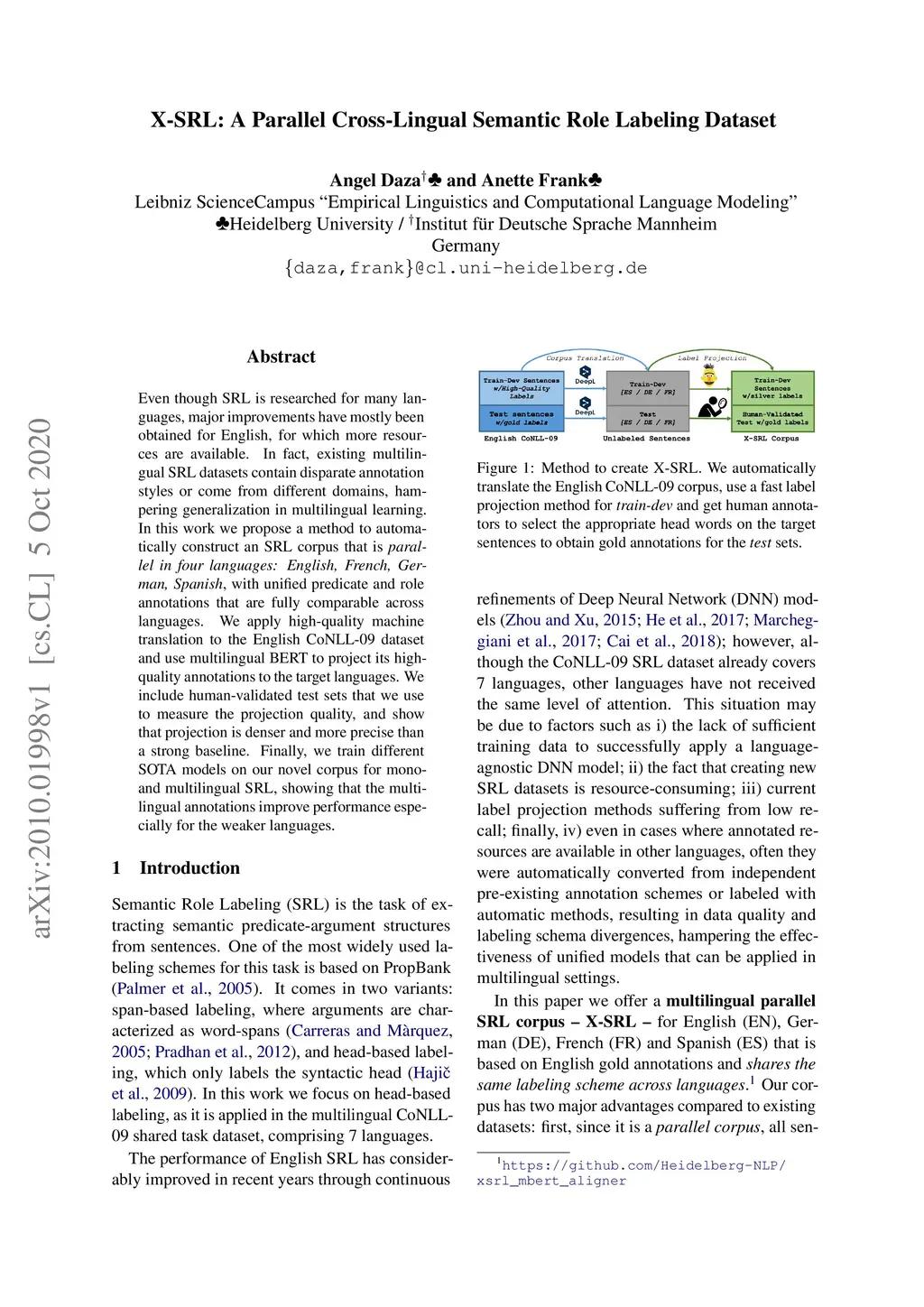 Even though SRL is researched for many languages, major improvements have mostly been obtained for English, for which more resources are available. In fact, existing multilingual SRL datasets contain disparate annotation styles or come from different domains, hampering generalization in multilingual learning. In this work, we propose a method to automatically construct an SRL corpus that is parallel in four languages: English, French, German, Spanish, with unified predicate and role annotations that are fully comparable across languages. We apply high-quality machine translation to the English CoNLL-09 dataset and use multilingual BERT to project its high-quality annotations to the target languages. We include human-validated test sets that we use to measure the projection quality, and show that projection is denser and more precise than a strong baseline. Finally, we train different SOTA models on our novel corpus for mono- and multilingual SRL, showing that the multilingual annotations improve performance especially for the weaker languages.