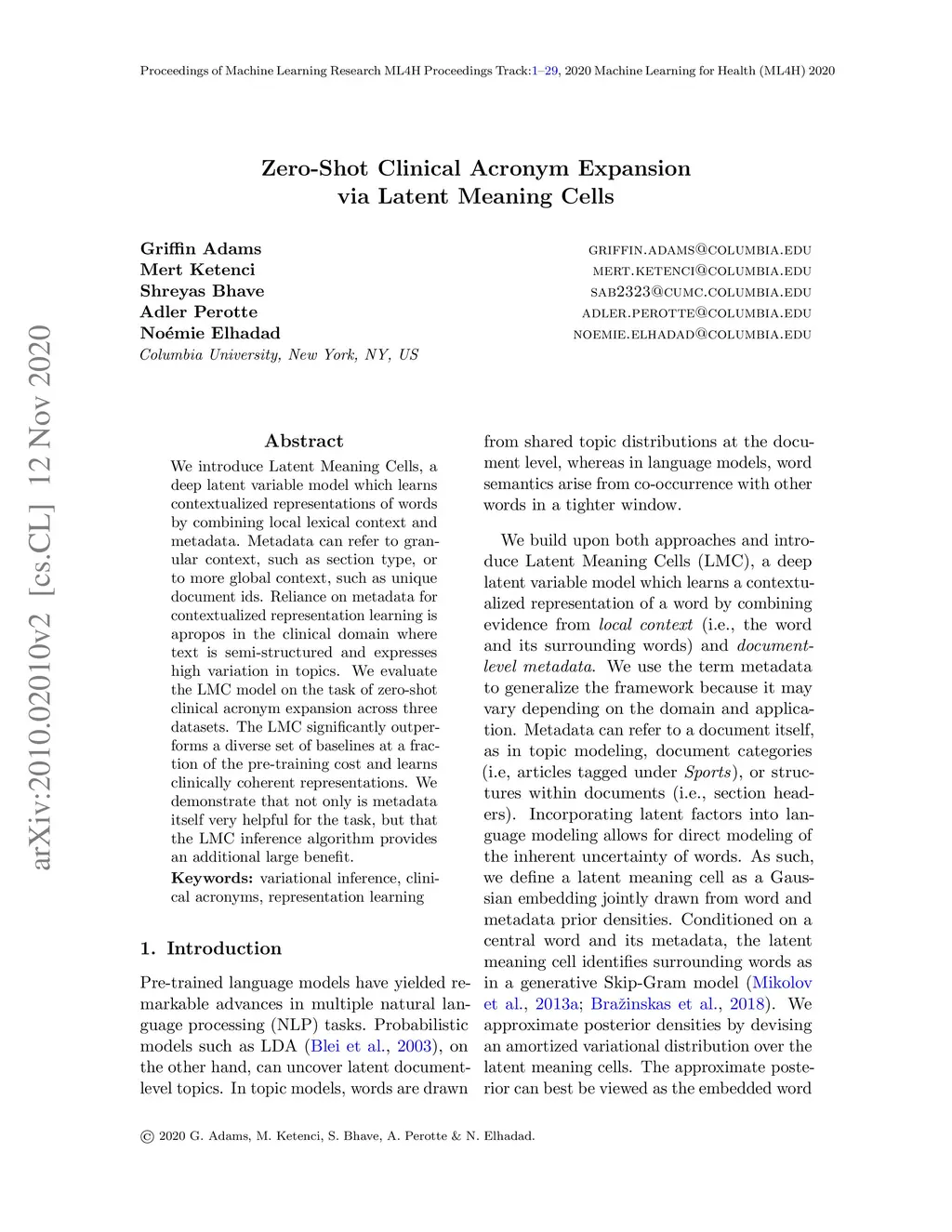 We introduce Latent Meaning Cells, a deep latent variable model which learns contextualized representations of words by combining local lexical context and metadata. Metadata can refer to granular context, such as section type, or to more global context, such as unique document ids. Reliance on metadata for contextualized representation learning is apropos in the clinical domain where text is semi-structured and expresses high variation in topics. We evaluate the LMC model on the task of zero-shot clinical acronym expansion across three datasets. The LMC significantly outperforms a diverse set of baselines at a fraction of the pre-training cost and learns clinically coherent representations. We demonstrate that not only is metadata itself very helpful for the task, but that the LMC inference algorithm provides an additional large benefit.