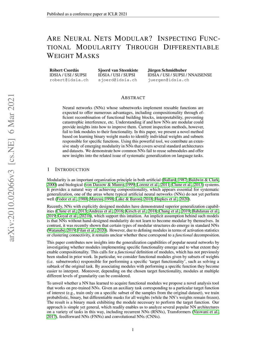 Neural networks (NNs) whose subnetworks implement reusable functions are expected to offer numerous advantages, including compositionality through efficient recombination of functional building blocks, interpretability, preventing catastrophic interference, etc. Understanding if and how NNs are modular could provide insights into how to improve them. Current inspection methods, however, fail to link modules to their functionality. In this paper, we present a novel method based on learning binary weight masks to identify individual weights and subnets responsible for specific functions. Using this powerful tool, we contribute an extensive study of emerging modularity in NNs that covers several standard architectures and datasets. We demonstrate how common NNs fail to reuse submodules and offer new insights into the related issue of systematic generalization on language tasks.