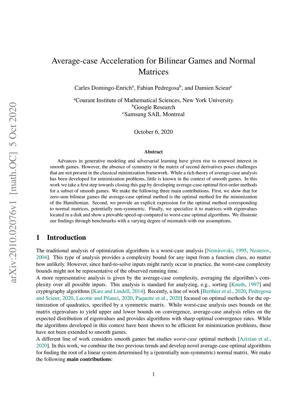 Advances in generative modeling and adversarial learning have given rise to renewed interest in smooth games. However, the absence of symmetry in the matrix of second derivatives poses challenges that are not present in the classical minimization framework. While a rich theory of average-case analysis has been developed for minimization problems, little is known in the context of smooth games. In this work we take a first step towards closing this gap by developing average-case optimal first-order methods for a subset of smooth games. We make the following three main contributions. First, we show that for zero-sum bilinear games the average-case optimal method is the optimal method for the minimization of the Hamiltonian. Second, we provide an explicit expression for the optimal method corresponding to normal matrices, potentially non-symmetric. Finally, we specialize it to matrices with eigenvalues located in a disk and show a provable speed-up compared to worst-case optimal algorithms. We illustrate our findings through benchmarks with a varying degree of mismatch with our assumptions.