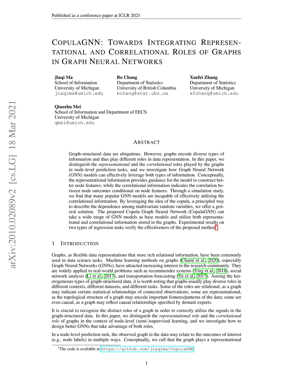 Graph-structured data are ubiquitous. However, graphs encode diverse types of information and thus play different roles in data representation. In this paper, we distinguish the \textit{representational} and the \textit{correlational} roles played by the graphs in node-level prediction tasks, and we investigate how Graph Neural Network (GNN) models can effectively leverage both types of information. Conceptually, the representational information provides guidance for the model to construct better node features; while the correlational information indicates the correlation between node outcomes conditional on node features. Through a simulation study, we find that many popular GNN models are incapable of effectively utilizing the correlational information. By leveraging the idea of the copula, a principled way to describe the dependence among multivariate random variables, we offer a general solution. The proposed Copula Graph Neural Network (CopulaGNN) can take a wide range of GNN models as base models and utilize both representational and correlational information stored in the graphs. Experimental results on two types of regression tasks verify the effectiveness of the proposed method.