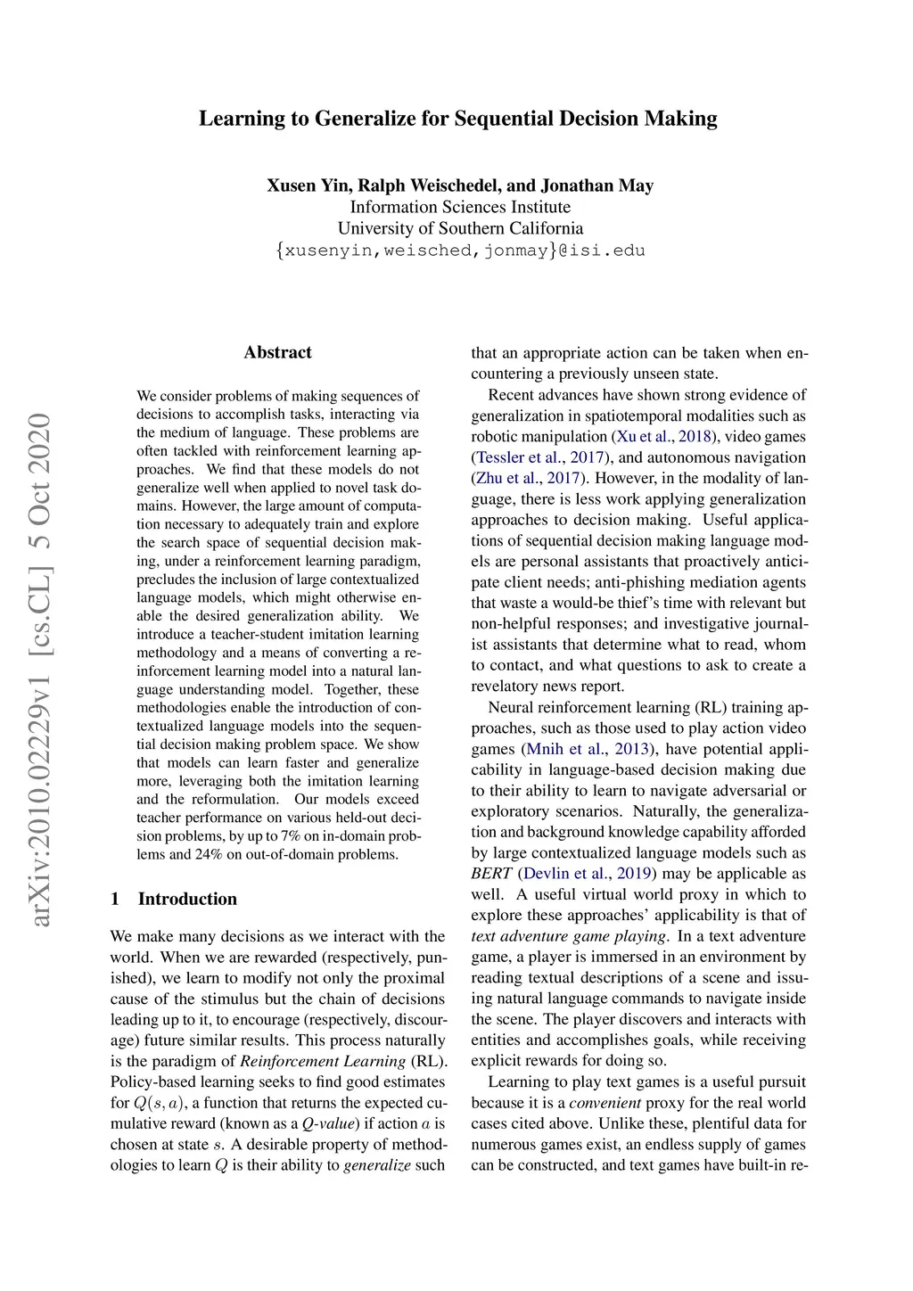 We consider problems of making sequences of decisions to accomplish tasks, interacting via the medium of language. These problems are often tackled with reinforcement learning approaches. We find that these models do not generalize well when applied to novel task domains. However, the large amount of computation necessary to adequately train and explore the search space of sequential decision making, under a reinforcement learning paradigm, precludes the inclusion of large contextualized language models, which might otherwise enable the desired generalization ability. We introduce a teacher-student imitation learning methodology and a means of converting a reinforcement learning model into a natural language understanding model. Together, these methodologies enable the introduction of contextualized language models into the sequential decision making problem space. We show that models can learn faster and generalize more, leveraging both the imitation learning and the reformulation. Our models exceed teacher performance on various held-out decision problems, by up to 7% on in-domain problems and 24% on out-of-domain problems.