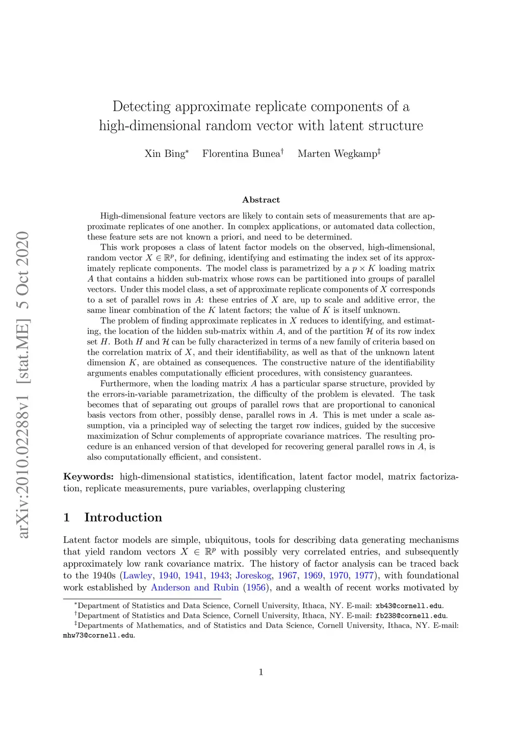 High-dimensional feature vectors are likely to contain sets of measurements that are approximate replicates of one another. In complex applications, or automated data collection, these feature sets are not known a priori, and need to be determined. This work proposes a class of latent factor models on the observed high-dimensional random vector , for defining, identifying and estimating the index set of its approximately replicate components. The model class is parametrized by a loading matrix that contains a hidden sub-matrix whose rows can be partitioned into groups of parallel vectors. Under this model class, a set of approximate replicate components of corresponds to a set of parallel rows in : these entries of are, up to scale and additive error, the same linear combination of the latent factors; the value of is itself unknown. The problem of finding approximate replicates in reduces to identifying, and estimating, the location of the hidden sub-matrix within , and of the partition of its row index set . Both and its partiton can be fully characterized in terms of a new family of criteria based on the correlation matrix of , and their identifiability, as well as that of the unknown latent dimension , are obtained as consequences. The constructive nature of the identifiability arguments enables computationally efficient procedures, with consistency guarantees. When has the errors-in-variable parametrization, the difficulty of the problem is elevated. The task becomes that of separating out groups of parallel rows that are proportional to canonical basis vectors from other dense parallel rows in . This is met under a scale assumption, via a principled way of selecting the target row indices, guided by the succesive maximization of Schur complements of appropriate covariance matrices.