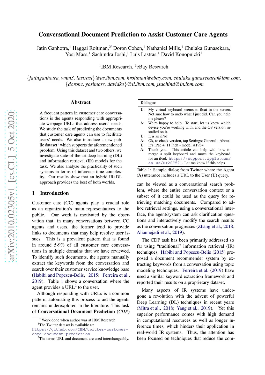 A frequent pattern in customer care conversations is the agents responding with appropriate webpage URLs that address users' needs. We study the task of predicting the documents that customer care agents can use to facilitate users' needs. We also introduce a new public dataset which supports the aforementioned problem. Using this dataset and two others, we investigate state-of-the art deep learning (DL) and information retrieval (IR) models for the task. Additionally, we analyze the practicality of such systems in terms of inference time complexity. Our show that an hybrid IR+DL approach provides the best of both worlds.