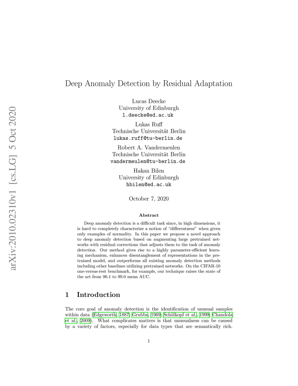 Deep Anomaly Detection by Residual Adaptation