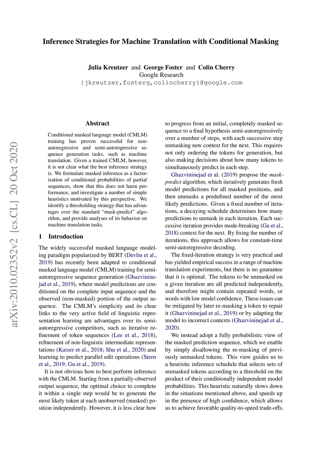 Conditional masked language model (CMLM) training has proven successful for non-autoregressive and semi-autoregressive sequence generation tasks, such as machine translation. Given a trained CMLM, however, it is not clear what the best inference strategy is. We formulate masked inference as a factorization of conditional probabilities of partial sequences, show that this does not harm performance, and investigate a number of simple heuristics motivated by this perspective. We identify a thresholding strategy that has advantages over the standard "mask-predict" algorithm, and provide analyses of its behavior on machine translation tasks.