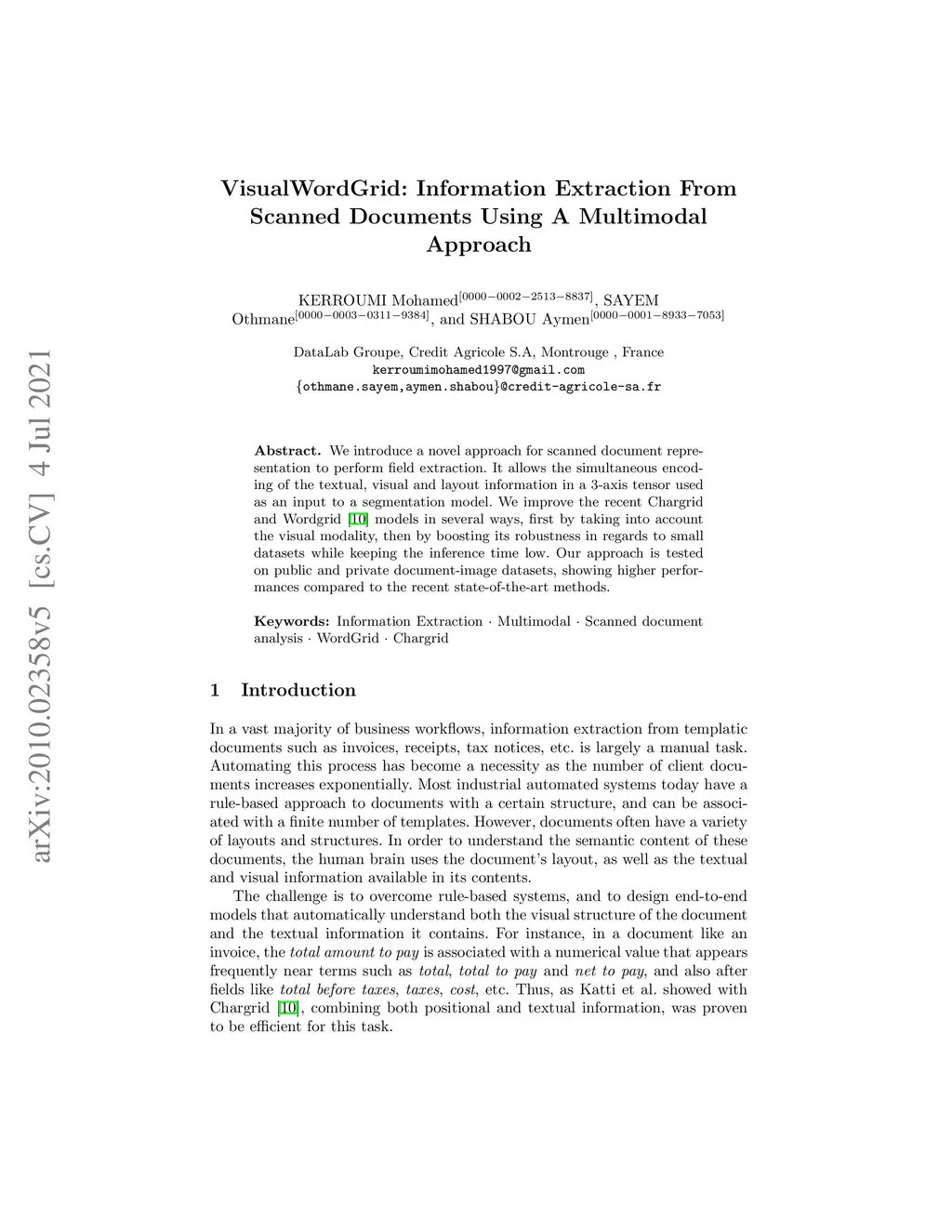 VisualWordGrid: Information Extraction From Scanned Documents Using A