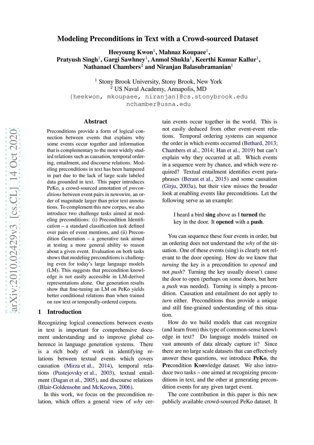 Preconditions provide a form of logical connection between events that explains why some events occur together and information that is complementary to the more widely studied relations such as causation, temporal ordering, entailment, and discourse relations. Modeling preconditions in text has been hampered in part due to the lack of large scale labeled data grounded in text. This paper introduces PeKo, a crowd-sourced annotation of preconditions between event pairs in newswire, an order of magnitude larger than prior text annotations. To complement this new corpus, we also introduce two challenge tasks aimed at modeling preconditions: (i) Precondition Identification -- a standard classification task defined over pairs of event mentions, and (ii) Precondition Generation -- a generative task aimed at testing a more general ability to reason about a given event. Evaluation on both tasks shows that modeling preconditions is challenging even for today's large language models (LM). This suggests that precondition knowledge is not easily accessible in LM-derived representations alone. Our generation results show that fine-tuning an LM on PeKo yields better conditional relations than when trained on raw text or temporally-ordered corpora.