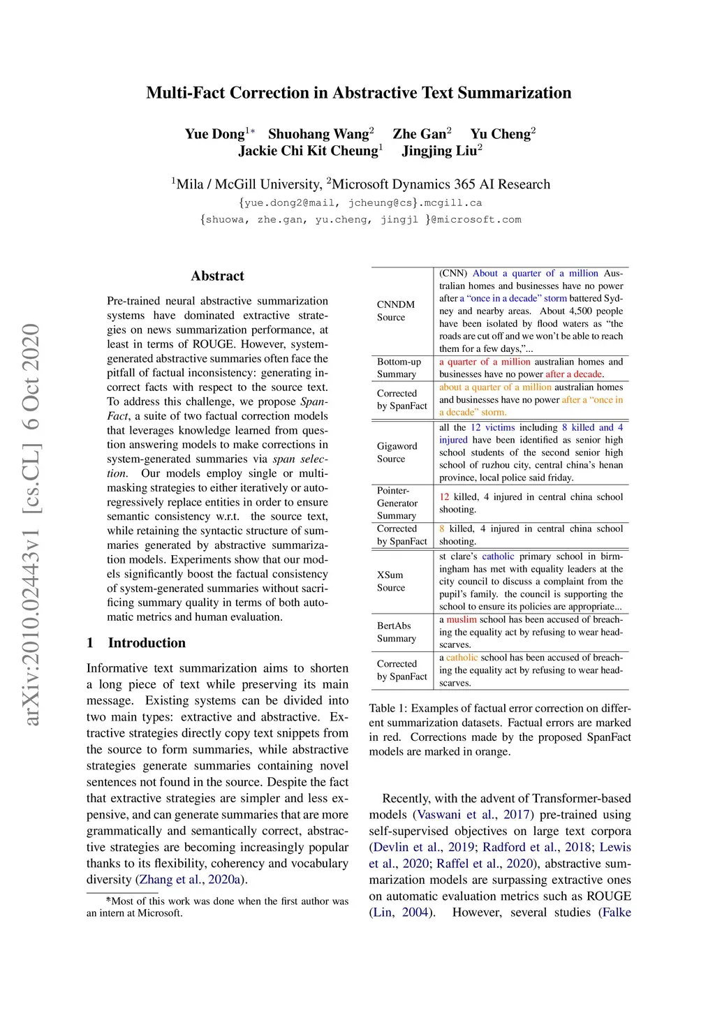 Pre-trained neural abstractive summarization systems have dominated extractive strategies on news summarization performance, at least in terms of ROUGE. However, system-generated abstractive summaries often face the pitfall of factual inconsistency: generating incorrect facts with respect to the source text. To address this challenge, we propose Span-Fact, a suite of two factual correction models that leverages knowledge learned from question answering models to make corrections in system-generated summaries via span selection. Our models employ single or multi-masking strategies to either iteratively or auto-regressively replace entities in order to ensure semantic consistency w.r.t. the source text, while retaining the syntactic structure of summaries generated by abstractive summarization models. Experiments show that our models significantly boost the factual consistency of system-generated summaries without sacrificing summary quality in terms of both automatic metrics and human evaluation.