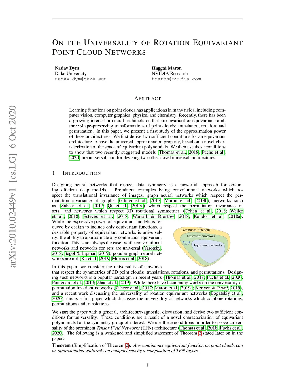 Learning functions on point clouds has applications in many fields, including computer vision, computer graphics, physics, and chemistry. Recently, there has been a growing interest in neural architectures that are invariant or equivariant to all three shape-preserving transformations of point clouds: translation, rotation, and permutation. In this paper, we present a first study of the approximation power of these architectures. We first derive two sufficient conditions for an equivariant architecture to have the universal approximation property, based on a novel characterization of the space of equivariant polynomials. We then use these conditions to show that two recently suggested models are universal, and for devising two other novel universal architectures.