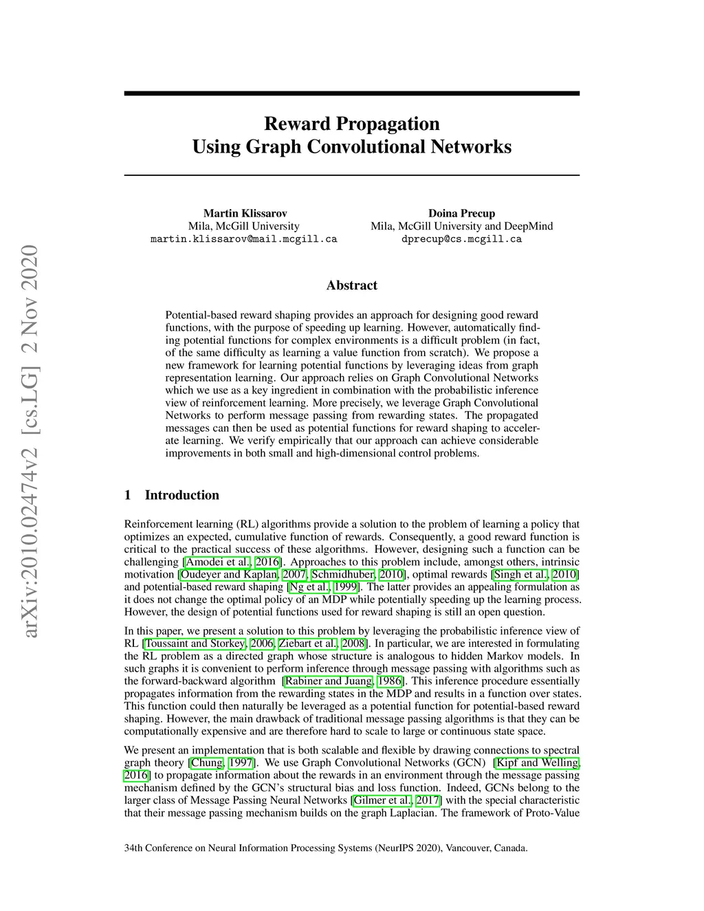 Reward Propagation Using Graph Convolutional Networks
