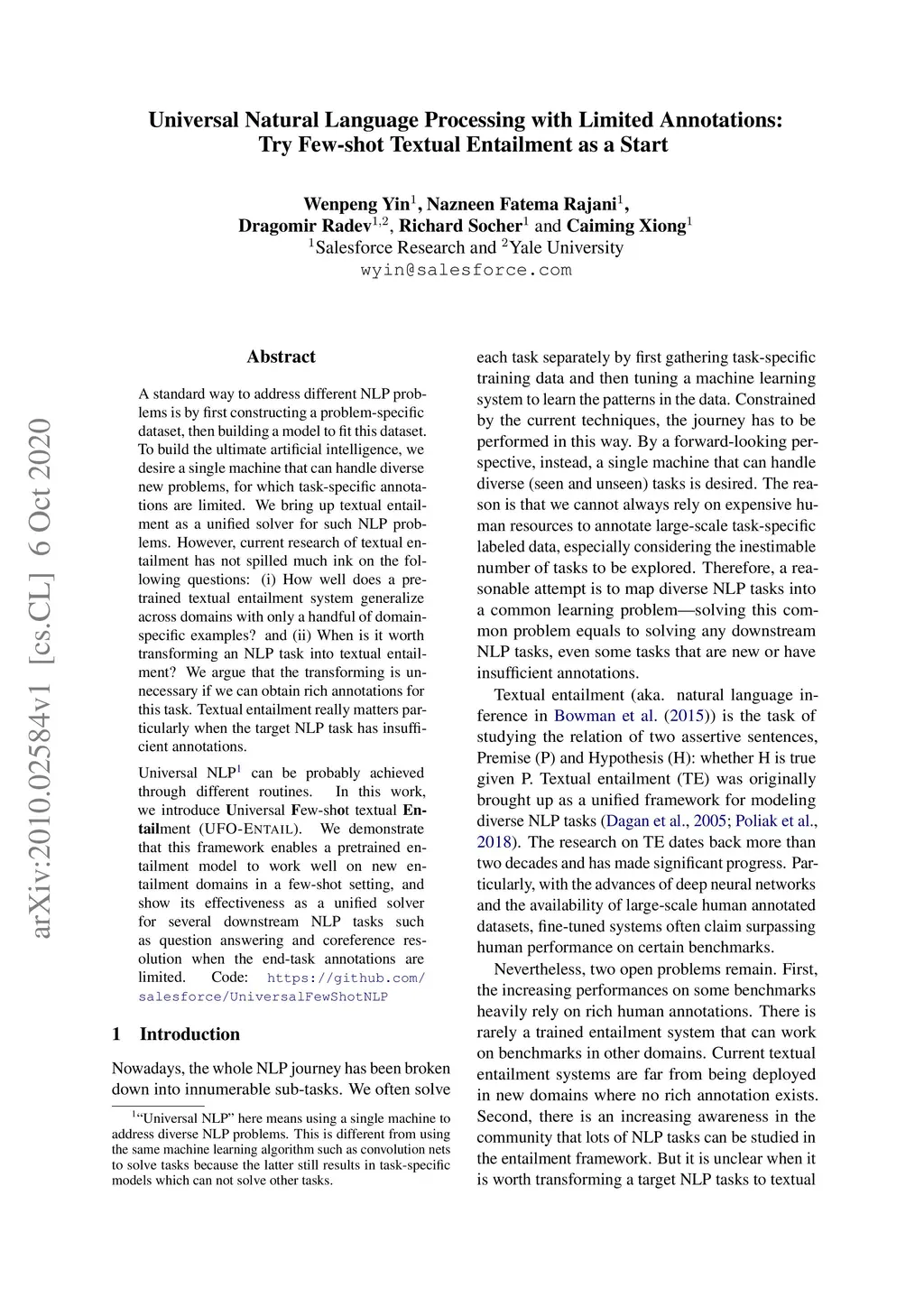 A standard way to address different NLP problems is by first constructing a problem-specific dataset, then building a model to fit this dataset. To build the ultimate artificial intelligence, we desire a single machine that can handle diverse new problems, for which task-specific annotations are limited. We bring up textual entailment as a unified solver for such NLP problems. However, current research of textual entailment has not spilled much ink on the following questions: (i) How well does a pretrained textual entailment system generalize across domains with only a handful of domain-specific examples? and (ii) When is it worth transforming an NLP task into textual entailment? We argue that the transforming is unnecessary if we can obtain rich annotations for this task. Textual entailment really matters particularly when the target NLP task has insufficient annotations. Universal NLP can be probably achieved through different routines. In this work, we introduce Universal Few-shot textual Entailment (UFO-Entail). We demonstrate that this framework enables a pretrained entailment model to work well on new entailment domains in a few-shot setting, and show its effectiveness as a unified solver for several downstream NLP tasks such as question answering and coreference resolution when the end-task annotations are limited. Code: https://github.com/salesforce/UniversalFewShotNLP