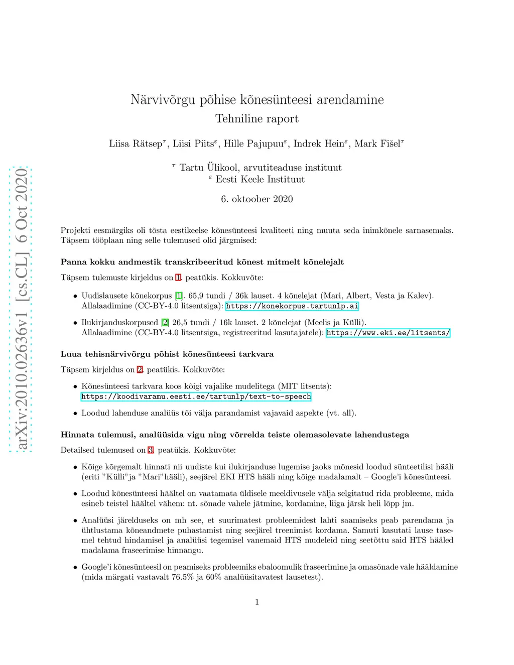This technical report describes the results of a collaboration between the NLP research group at the University of Tartu and the Institute of Estonian Language on improving neural speech synthesis for Estonian. The report (written in Estonian) describes the project results, the summary of which is: (1) Speech synthesis data from 6 speakers for a total of 92.4 hours is collected and openly released (CC-BY-4.0). Data available at https://konekorpus.tartunlp.ai and https://www.eki.ee/litsents/. (2) software and models for neural speech synthesis is released open-source (MIT license). Available at https://koodivaramu.eesti.ee/tartunlp/text-to-speech . (3) We ran evaluations of the new models and compared them to other existing solutions (HMM-based HTS models from EKI, http://www.eki.ee/heli/, and Google's speech synthesis for Estonian, accessed via https://translate.google.com). Evaluation includes voice acceptability MOS scores for sentence-level and longer excerpts, detailed error analysis and evaluation of the pre-processing module.