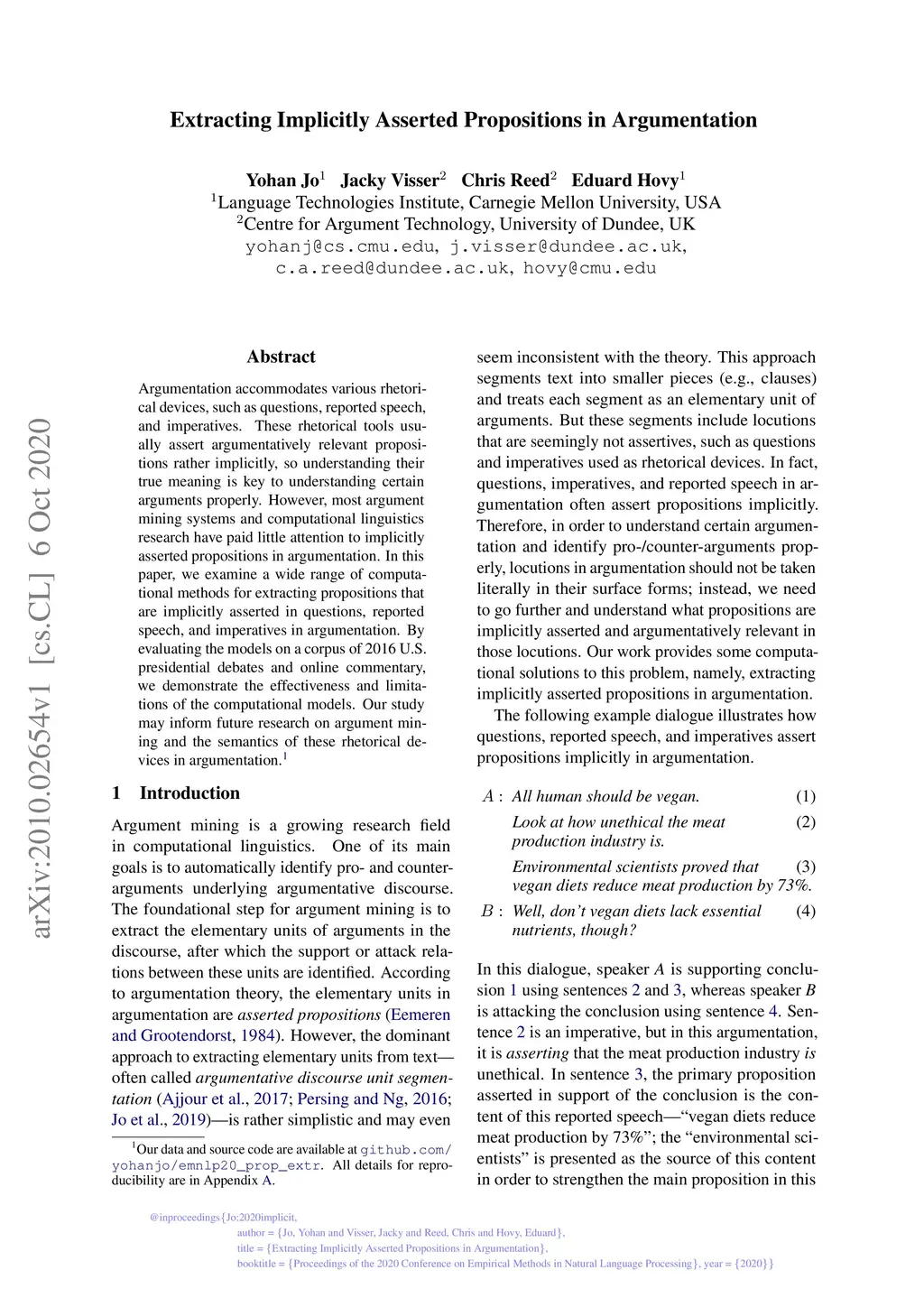 Argumentation accommodates various rhetorical devices, such as questions, reported speech, and imperatives. These rhetorical tools usually assert argumentatively relevant propositions rather implicitly, so understanding their true meaning is key to understanding certain arguments properly. However, most argument mining systems and computational linguistics research have paid little attention to implicitly asserted propositions in argumentation. In this paper, we examine a wide range of computational methods for extracting propositions that are implicitly asserted in questions, reported speech, and imperatives in argumentation. By evaluating the models on a corpus of 2016 U.S. presidential debates and online commentary, we demonstrate the effectiveness and limitations of the computational models. Our study may inform future research on argument mining and the semantics of these rhetorical devices in argumentation.