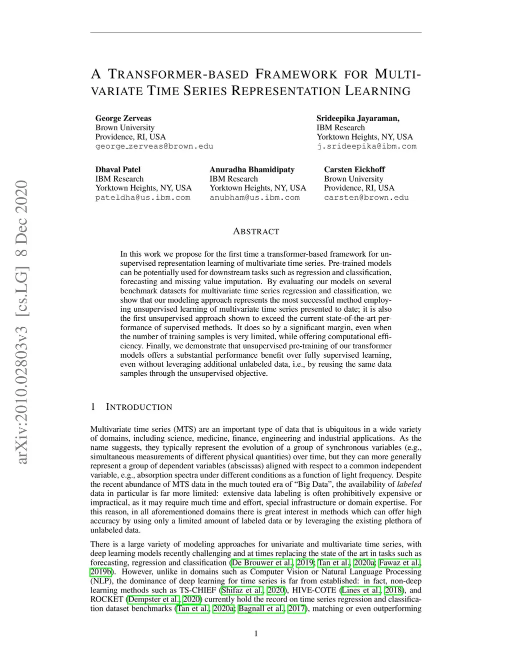 In this work we propose for the first time a transformer-based framework for unsupervised representation learning of multivariate time series. Pre-trained models can be potentially used for downstream tasks such as regression and classification, forecasting and missing value imputation. By evaluating our models on several benchmark datasets for multivariate time series regression and classification, we show that not only does our modeling approach represent the most successful method employing unsupervised learning of multivariate time series presented to date, but also that it exceeds the current state-of-the-art performance of supervised methods; it does so even when the number of training samples is very limited, while offering computational efficiency. Finally, we demonstrate that unsupervised pre-training of our transformer models offers a substantial performance benefit over fully supervised learning, even without leveraging additional unlabeled data, i.e., by reusing the same data samples through the unsupervised objective.
