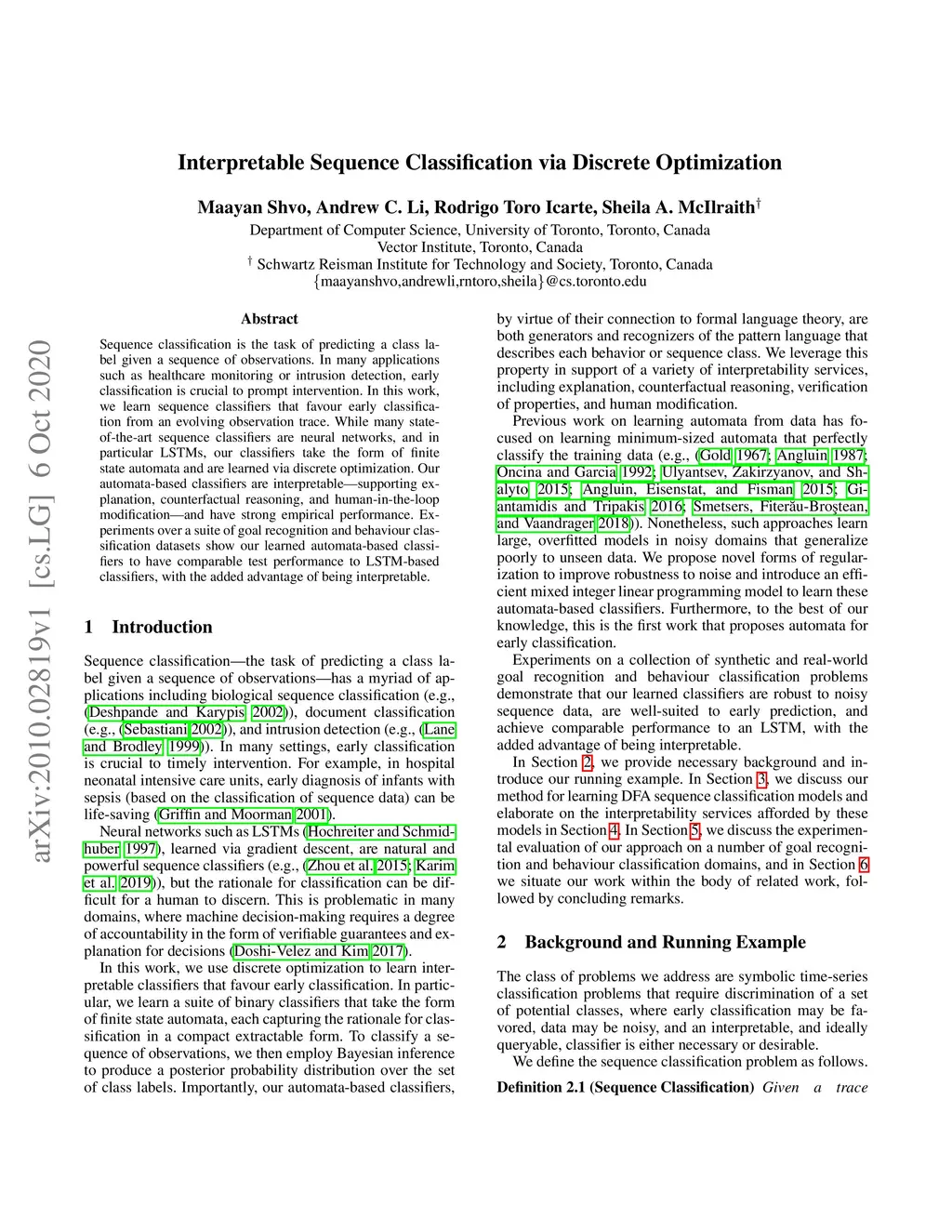 Interpretable Sequence Classification via Discrete Optimization