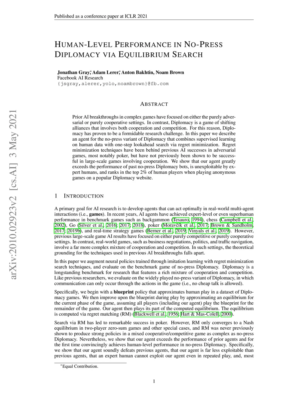 Prior AI breakthroughs in complex games have focused on either the purely adversarial or purely cooperative settings. In contrast, Diplomacy is a game of shifting alliances that involves both cooperation and competition. For this reason, Diplomacy has proven to be a formidable research challenge. In this paper we describe an agent for the no-press variant of Diplomacy that combines supervised learning on human data with one-step lookahead search via regret minimization. Regret minimization techniques have been behind previous AI successes in adversarial games, most notably poker, but have not previously been shown to be successful in large-scale games involving cooperation. We show that our agent greatly exceeds the performance of past no-press Diplomacy bots, is unexploitable by expert humans, and ranks in the top 2% of human players when playing anonymous games on a popular Diplomacy website.