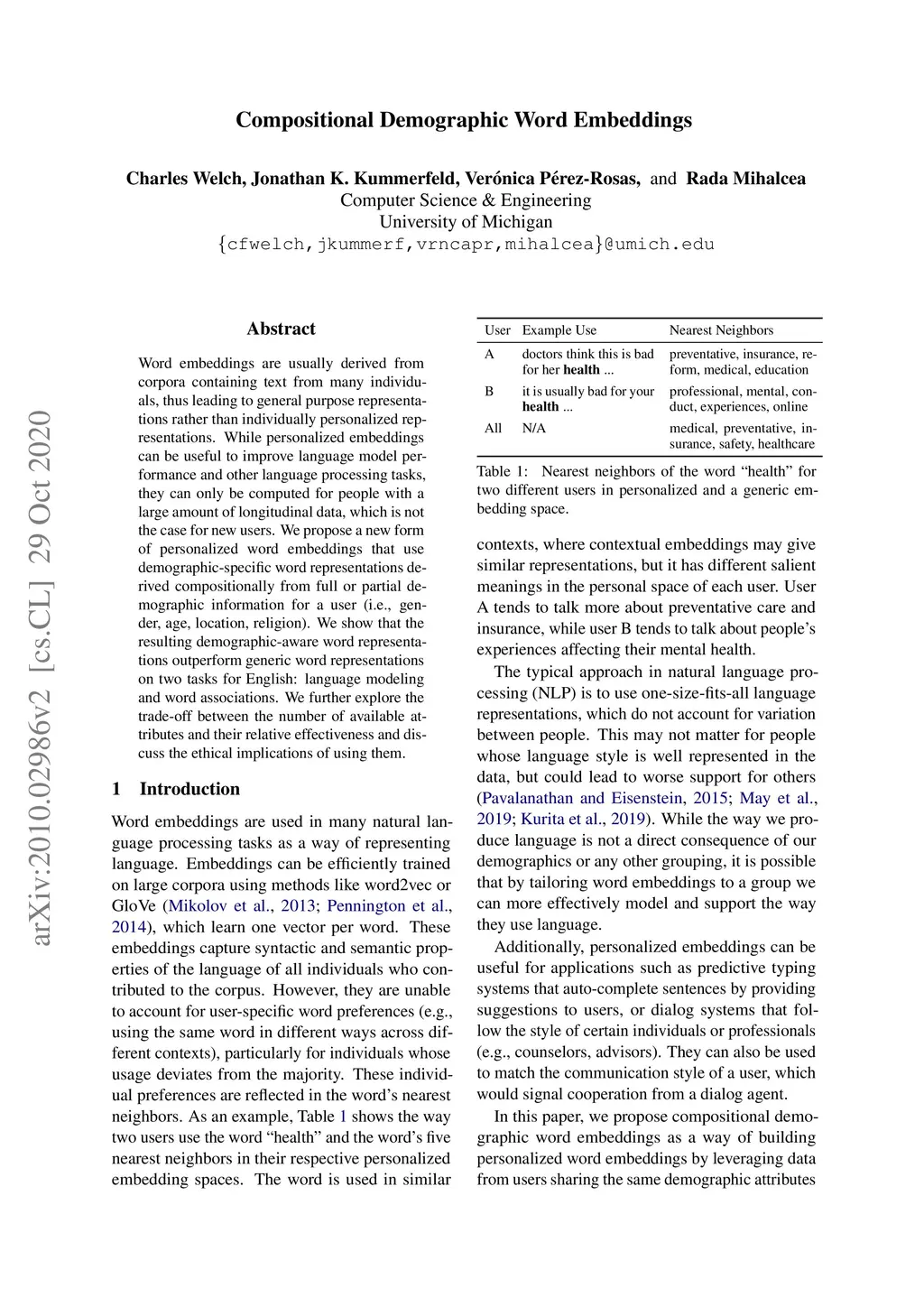 Word embeddings are usually derived from corpora containing text from many individuals, thus leading to general purpose representations rather than individually personalized representations. While personalized embeddings can be useful to improve language model performance and other language processing tasks, they can only be computed for people with a large amount of longitudinal data, which is not the case for new users. We propose a new form of personalized word embeddings that use demographic-specific word representations derived compositionally from full or partial demographic information for a user (i.e., gender, age, location, religion). We show that the resulting demographic-aware word representations outperform generic word representations on two tasks for English: language modeling and word associations. We further explore the trade-off between the number of available attributes and their relative effectiveness and discuss the ethical implications of using them.