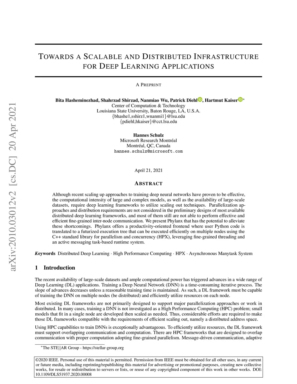 Although recent scaling up approaches to training deep neural networks have proven to be effective, the computational intensity of large and complex models, as well as the availability of large-scale datasets, require deep learning frameworks to utilize scaling out techniques. Parallelization approaches and distribution requirements are not considered in the preliminary designs of most available distributed deep learning frameworks, and most of them still are not able to perform effective and efficient fine-grained inter-node communication. We present Phylanx that has the potential to alleviate these shortcomings. Phylanx offers a productivity-oriented frontend where user Python code is translated to a futurized execution tree that can be executed efficiently on multiple nodes using the C++ standard library for parallelism and concurrency (HPX), leveraging fine-grained threading and an active messaging task-based runtime system.